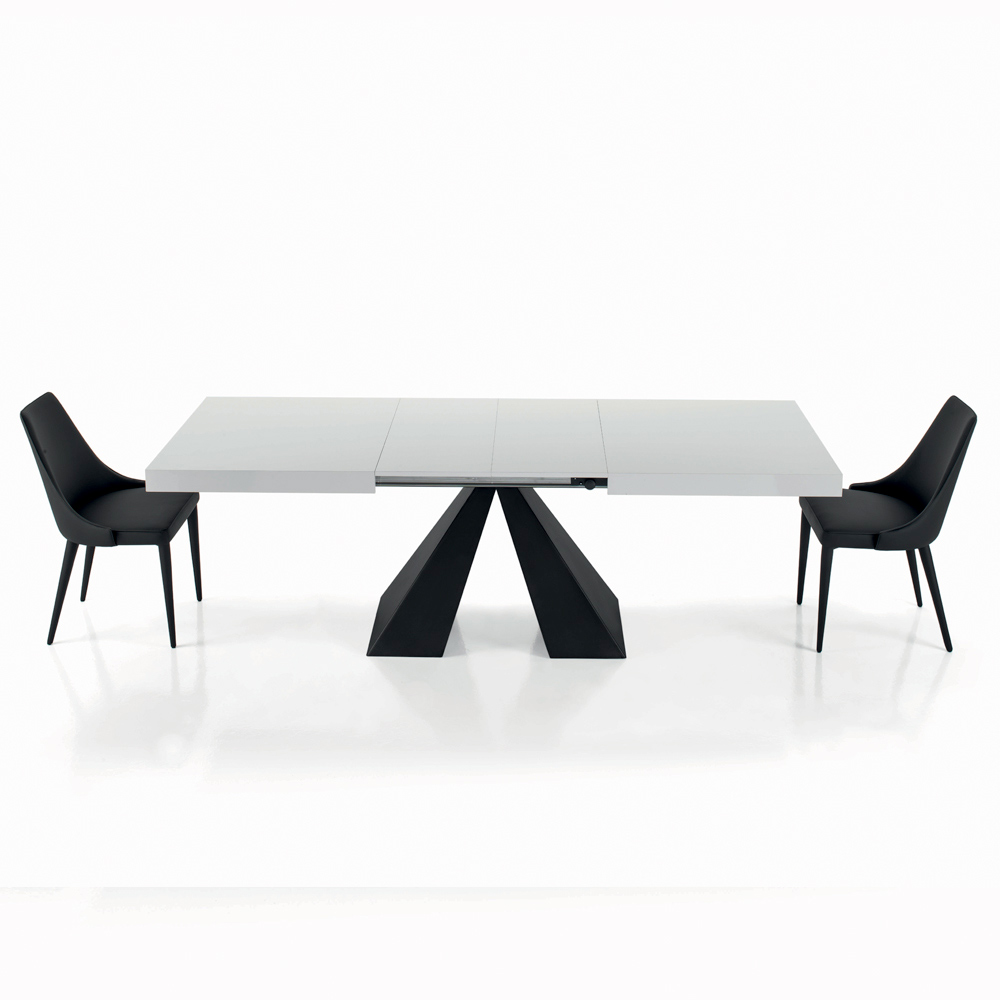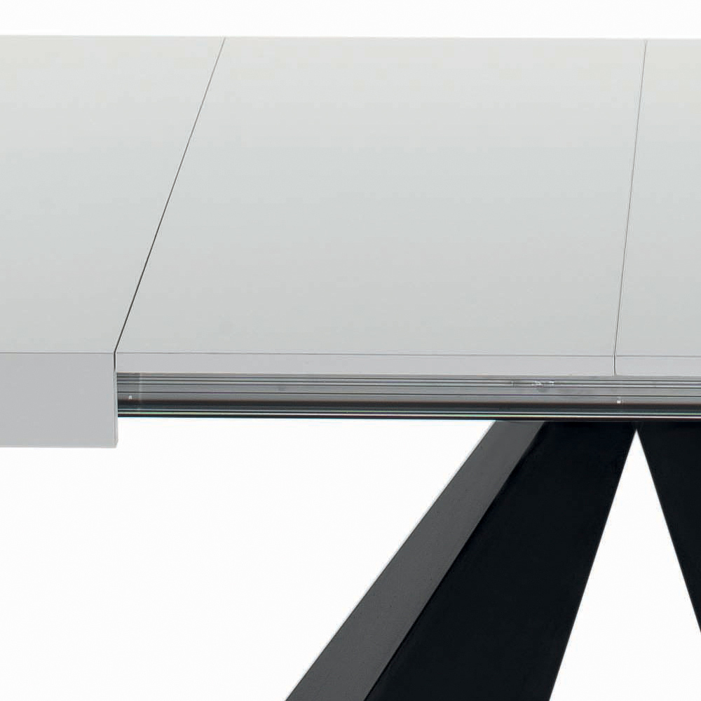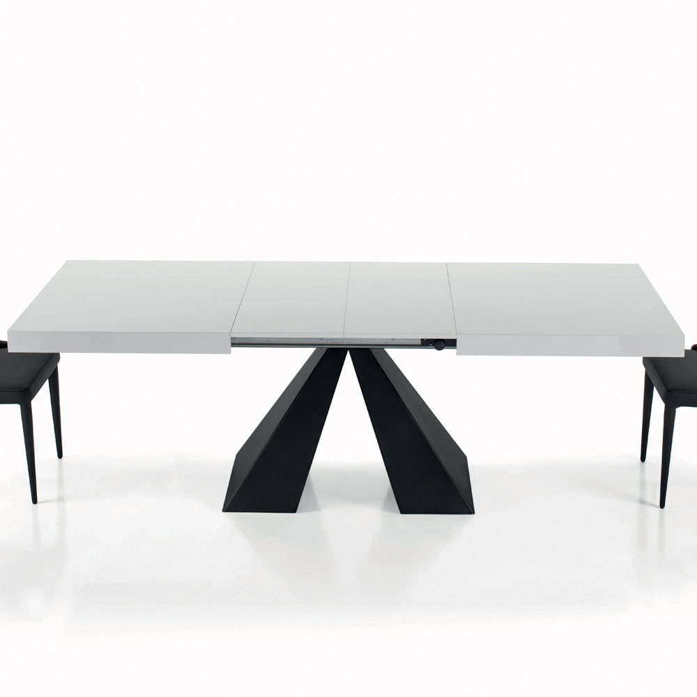 Tavolinë e zgjerueshme e dhomës së ndenjes me hapje qendrore të sinkronizuar (zgjatje të brendshme), majë laminate në fund të bardhë mat, buzë të palosshme , bazë çeliku të llakuar me ngjyrë të zezë dhe këmbë të rregullueshme. Zejtarët italianë që krijuan këtë produkt u përkushtuan të zgjidhnin materialet më të mira dhe saktësinë për çdo detaj për t'i garantuar klientit një tavolinë jo vetëm të bukur por edhe funksionale dhe të përdorshme në raste të ndryshme . Ky element është i përsosur për të dekoruar çdo ambient të përditshëm dhe kontraktues, duke i dhënë dhomës një prekje unike dhe elegante.