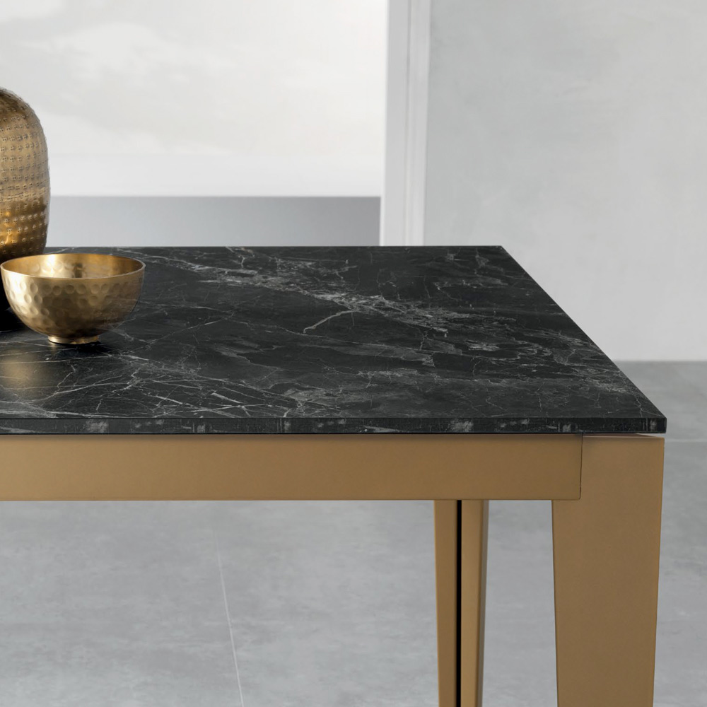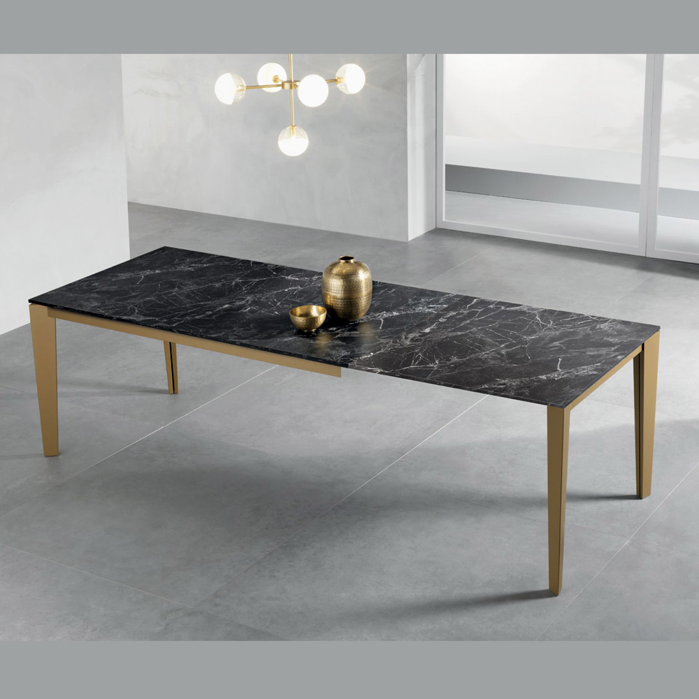 Elegante dhe funksionale, kjo tavolinë drejtkëndëshe e zgjerueshme kombinon dizajnin modern dhe praktikën. Sipërfaqja e laminuar me efekt mermeri të errët me trashësi 18 mm nxjerr në pah fibrat e ngrohta dhe autentike të mermerit, ndërsa këmbët metalike të lyera me ar të vjetër shtojnë stabilitet dhe një prekje bashkëkohore.