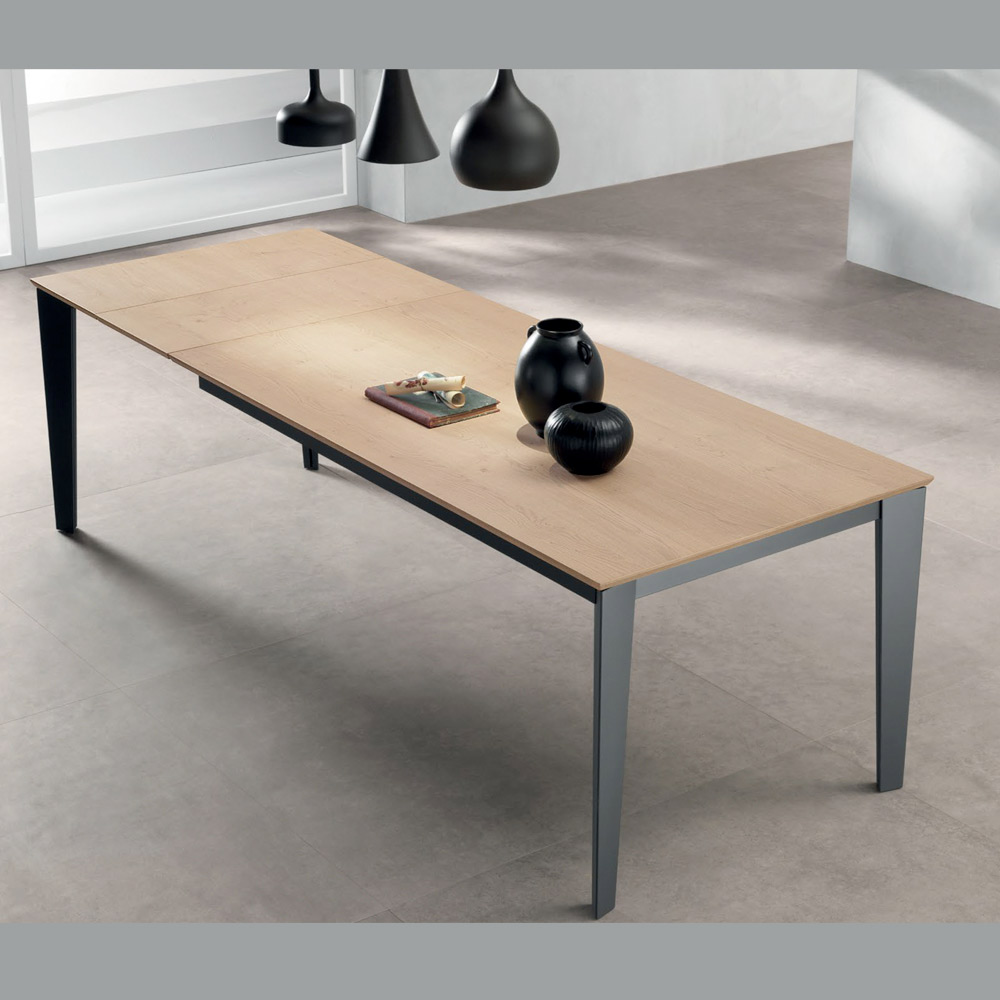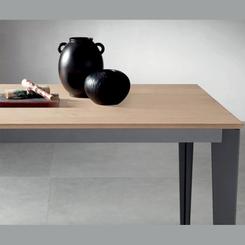 Elegante dhe funksionale, kjo tavolinë drejtkëndëshe e zgjerueshme kombinon dizajnin modern dhe praktikën. Sipërfaqja e sipërme prej rimeso lisi natyral me trashësi 22 mm nxjerr në pah fibrat e ngrohta dhe autentike të drurit, ndërsa këmbët metalike të lyera me antracit ofrojnë stabilitet dhe një prekje bashkëkohore.
