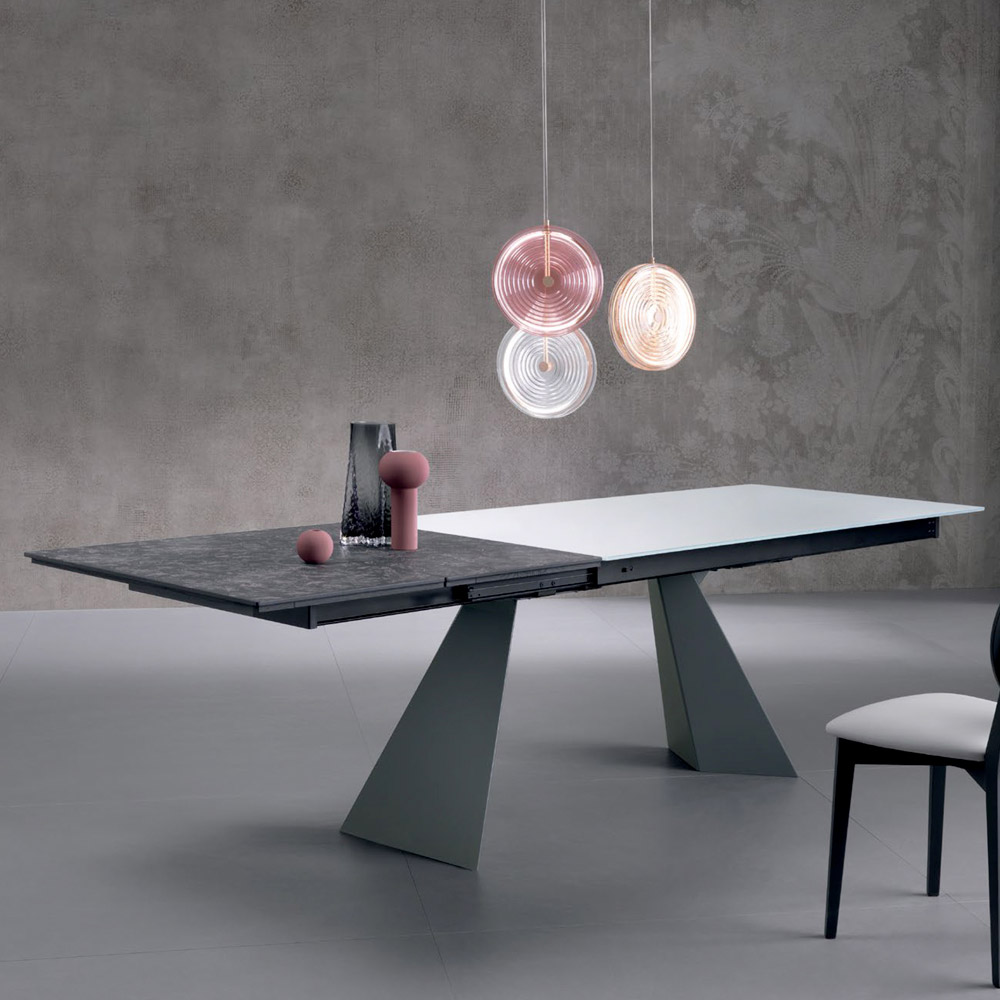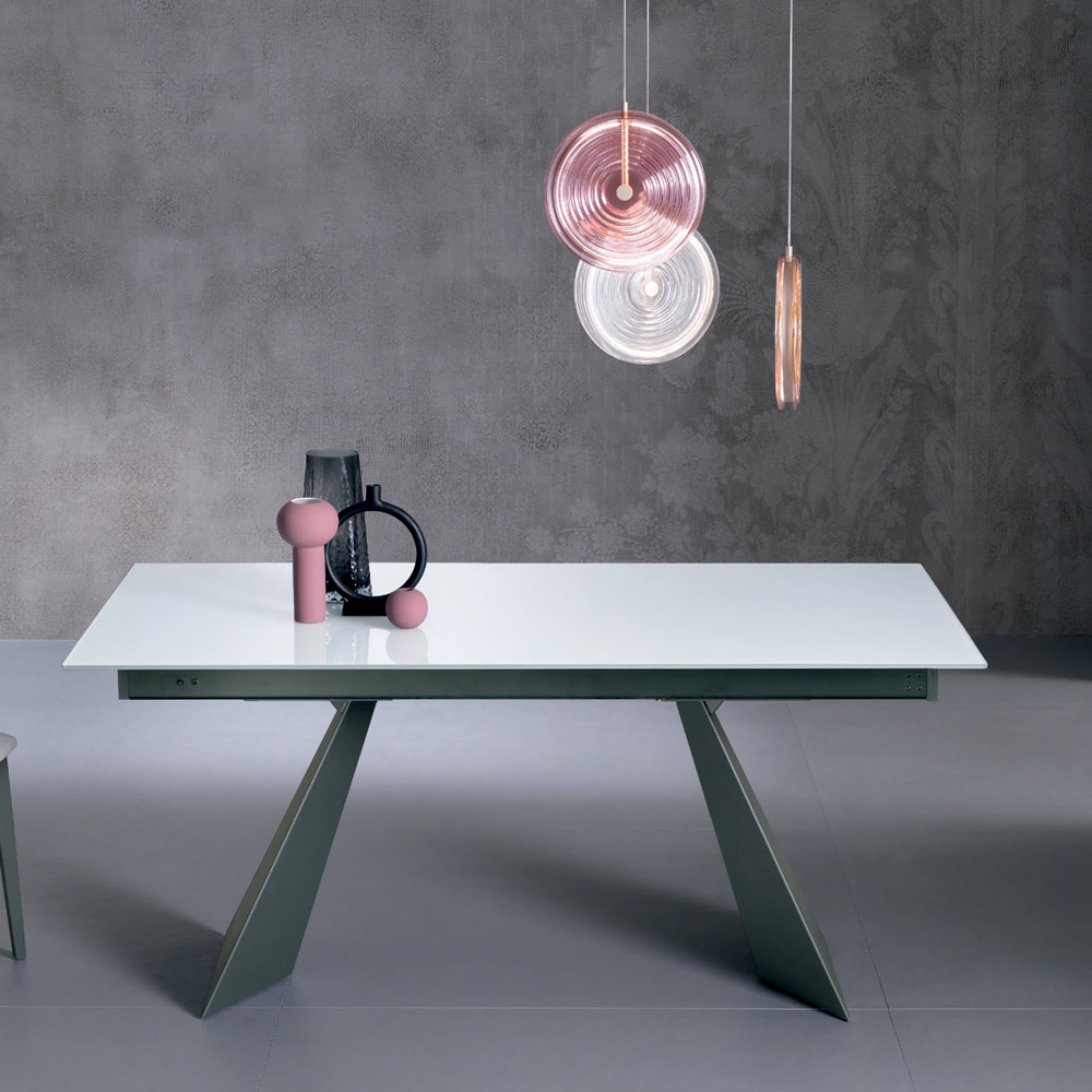 Kjo tavolinë kombinon kreativitetin arkitektonik dhe sofistikimin bashkëkohor , duke transformuar çdo dhomë në një hapësirë elegante . Sipërfaqja prej qelqi qumështi (10 mm e trashë) shpreh gjithë bukurinë e elegancës. , ndërsa skaji i hollë dhe pak i pjerrët i jep lehtësi vizuale dhe një prekje moderniteti.