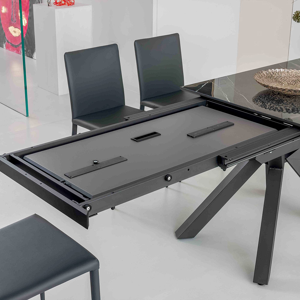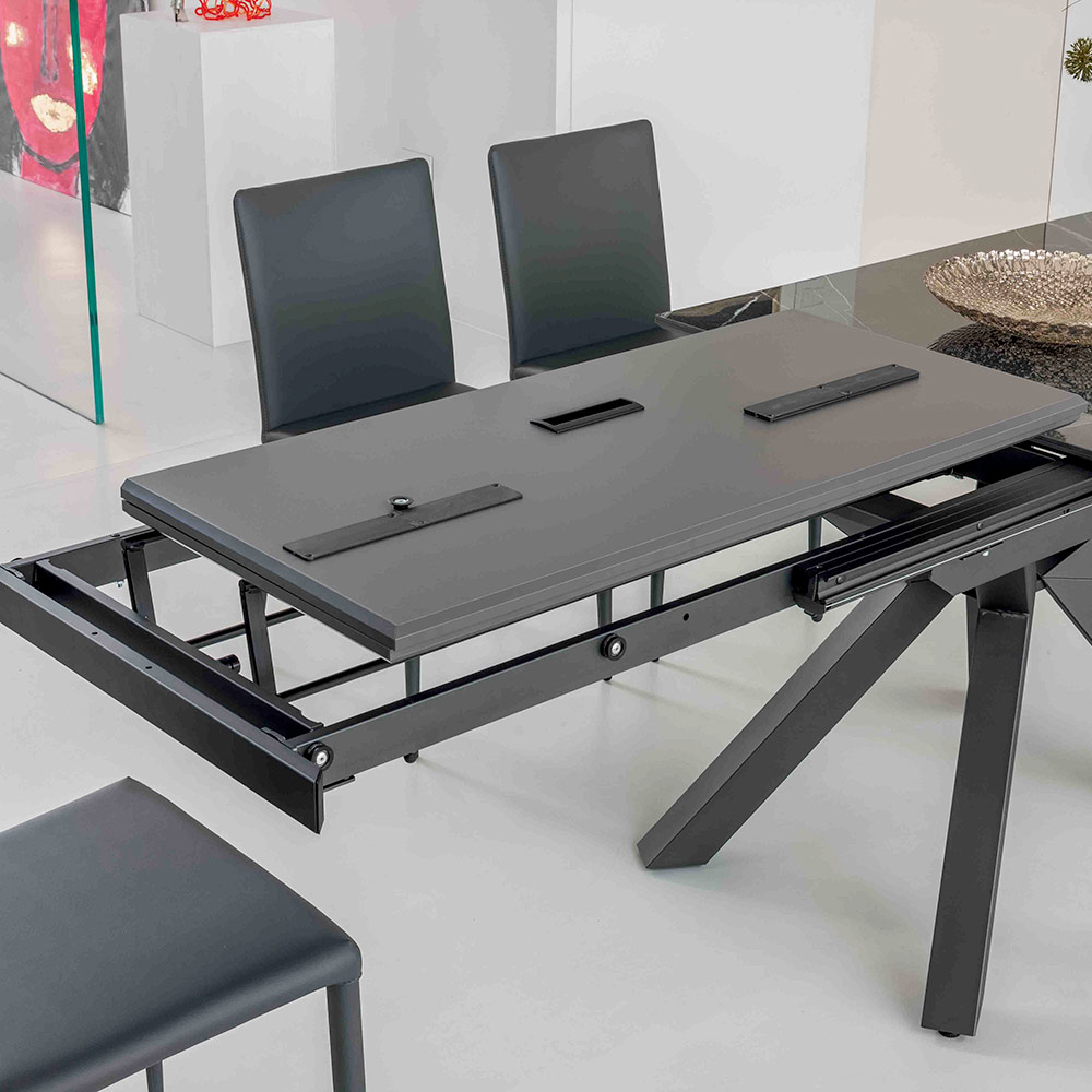 Tabela përfaqëson sintezën e përsosur midis inxhinierisë më të fundit dhe dizajnit estetik. Kjo nuk është thjesht një tavolinë e zgjatur, por një vepër funksionale arti, e krijuar për ata që nuk duan të bëjnë kompromis mes stilit dhe hapësirës.