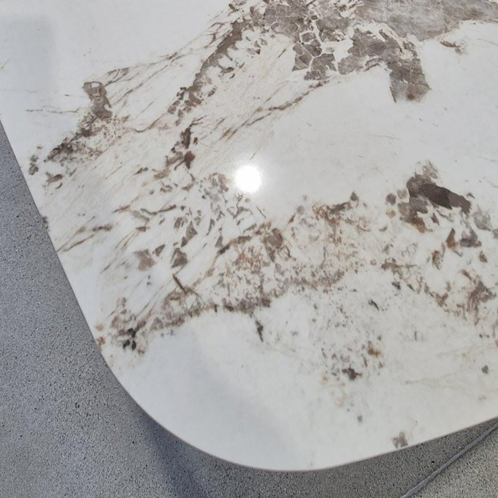 Kjo tavolinë prej gresi dhe metali kombinon dizajnin modern dhe materialet në modë për të krijuar një mobilje vizualisht tërheqëse. Sipërfaqja prej gresi me efekt mermeri , me fibrat e saj natyrale dhe përfundimin me shkëlqim, i jep një elegancë të rafinuar dhe bashkëkohore çdo hapësire. Baza metalike e endur , me format e saj fluide dhe dinamike, bëhet elementi i vërtetë skulpturor i tavolinës: e fortë por dredha-dredha, ajo i jep ekuilibër dhe personalitet të gjithë strukturës.