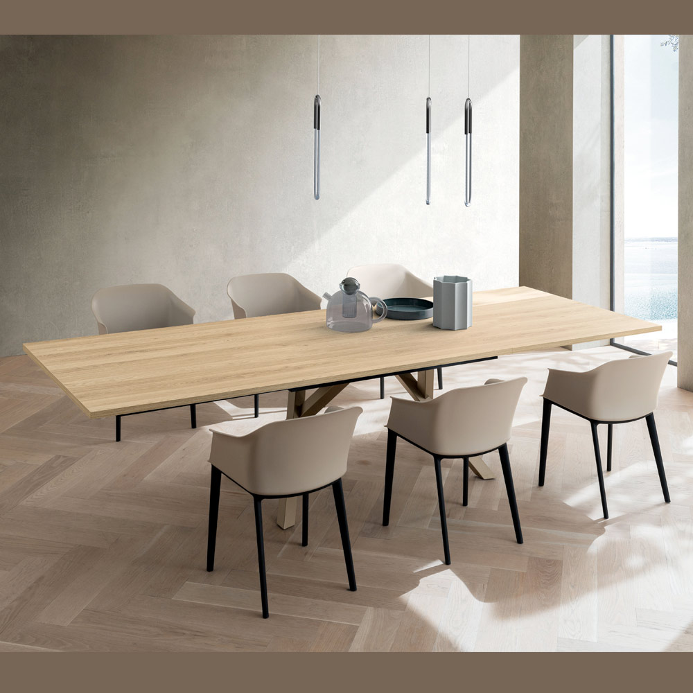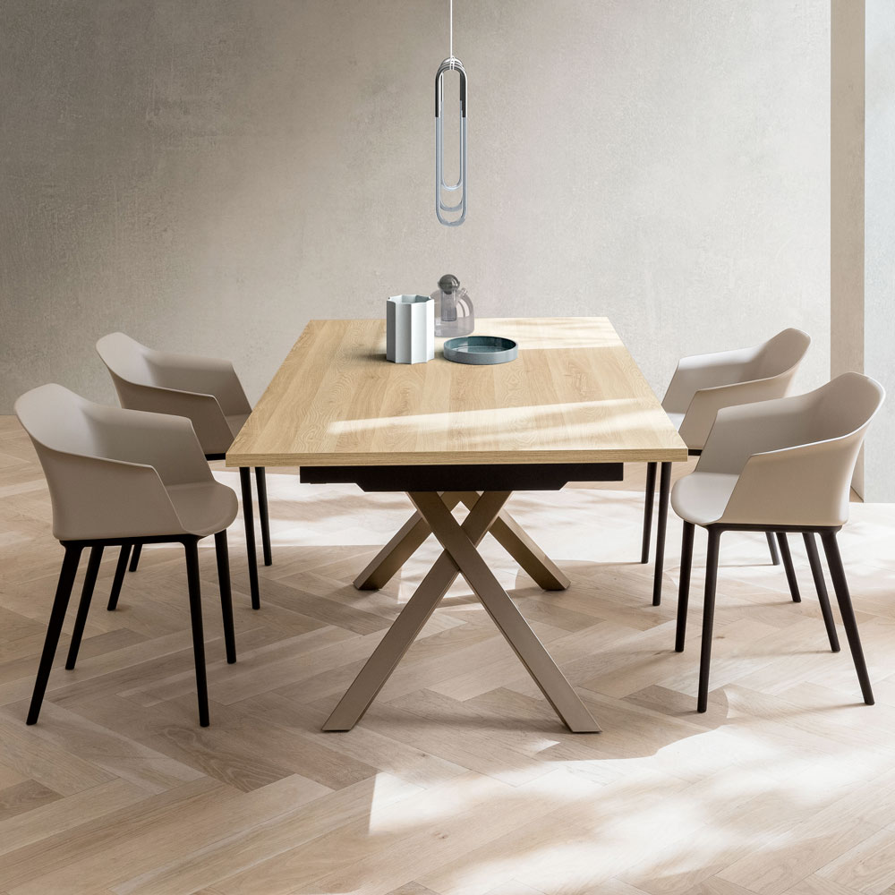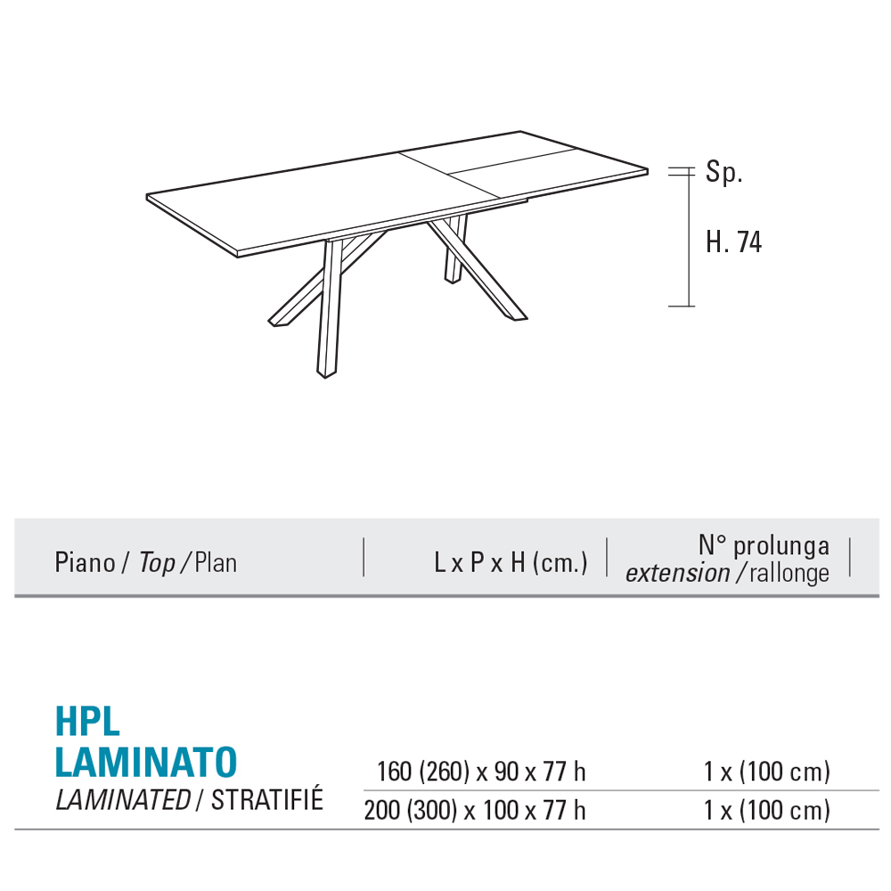 Sipërfaqja HPL është perfekte për përdorim të përditshëm pa sakrifikuar estetikën. Falë mekanizmit të integruar të zgjatjes , tavolina zgjerohet lehtësisht për të akomoduar më shumë mysafirë, duke u bërë protagonistja perfekte e drekave dhe darkave familjare me miqtë.
