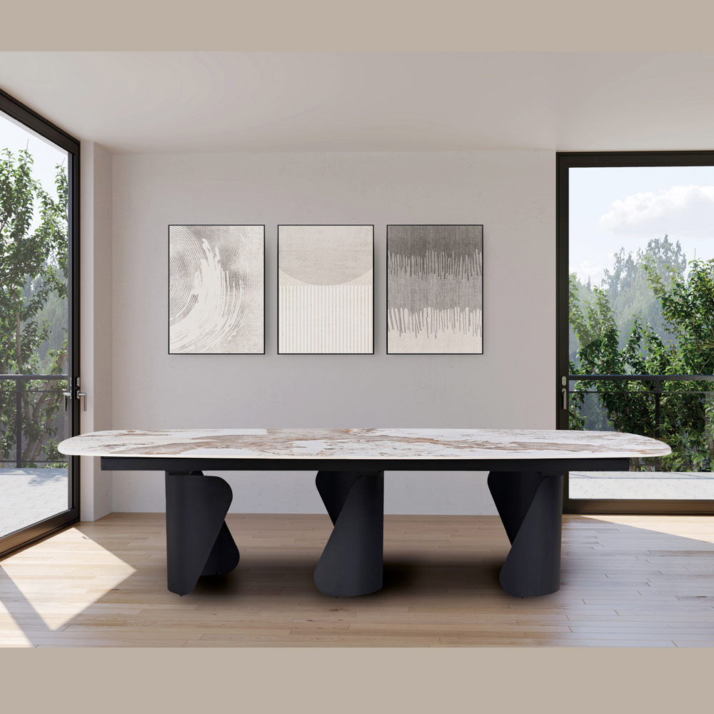 E projektuar për hapësira të mëdha, kjo tavolinë është perfekte për dhoma ngrënieje luksoze, dhoma takimesh ose ambiente mikpritjeje të nivelit të lartë .