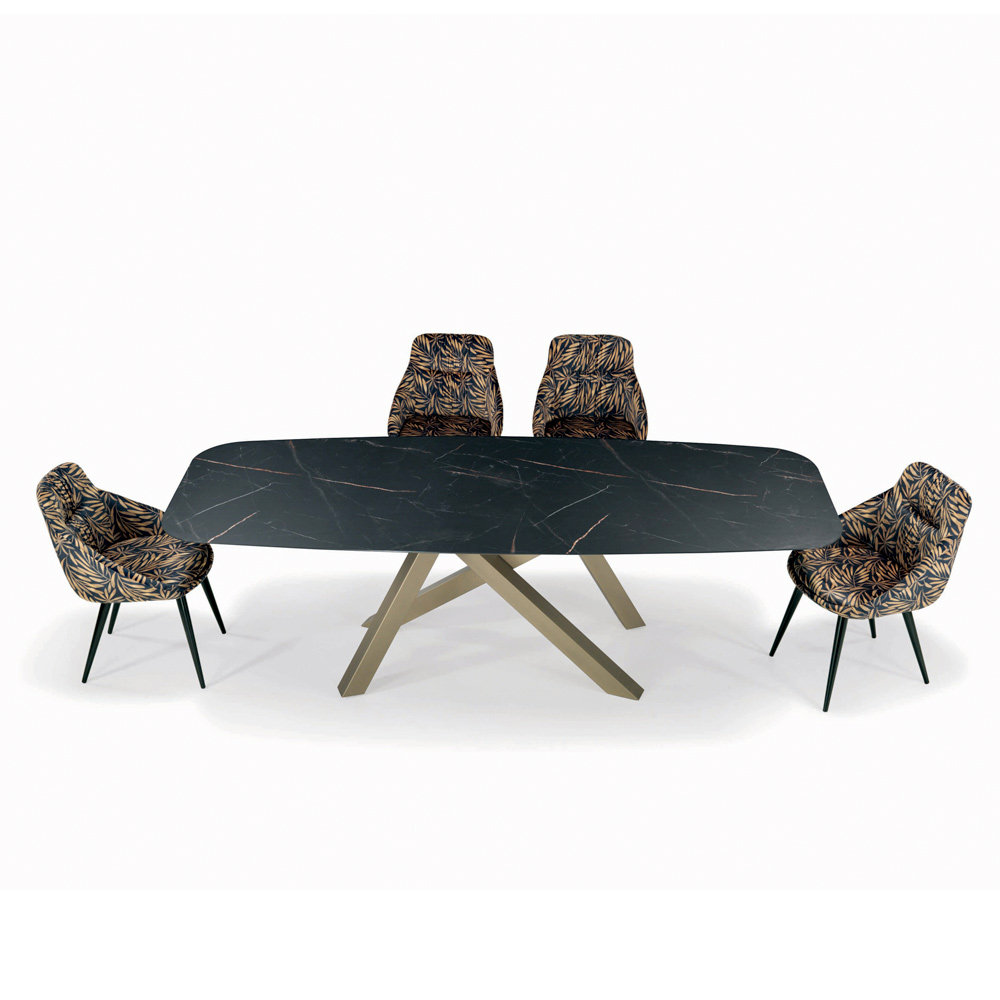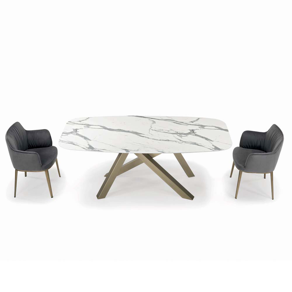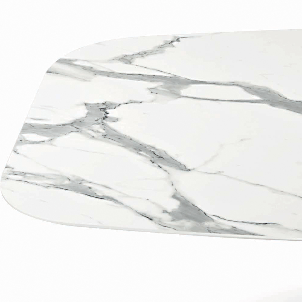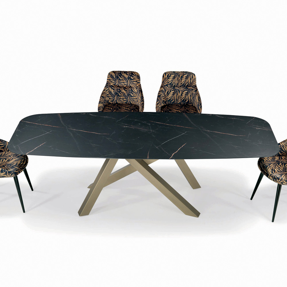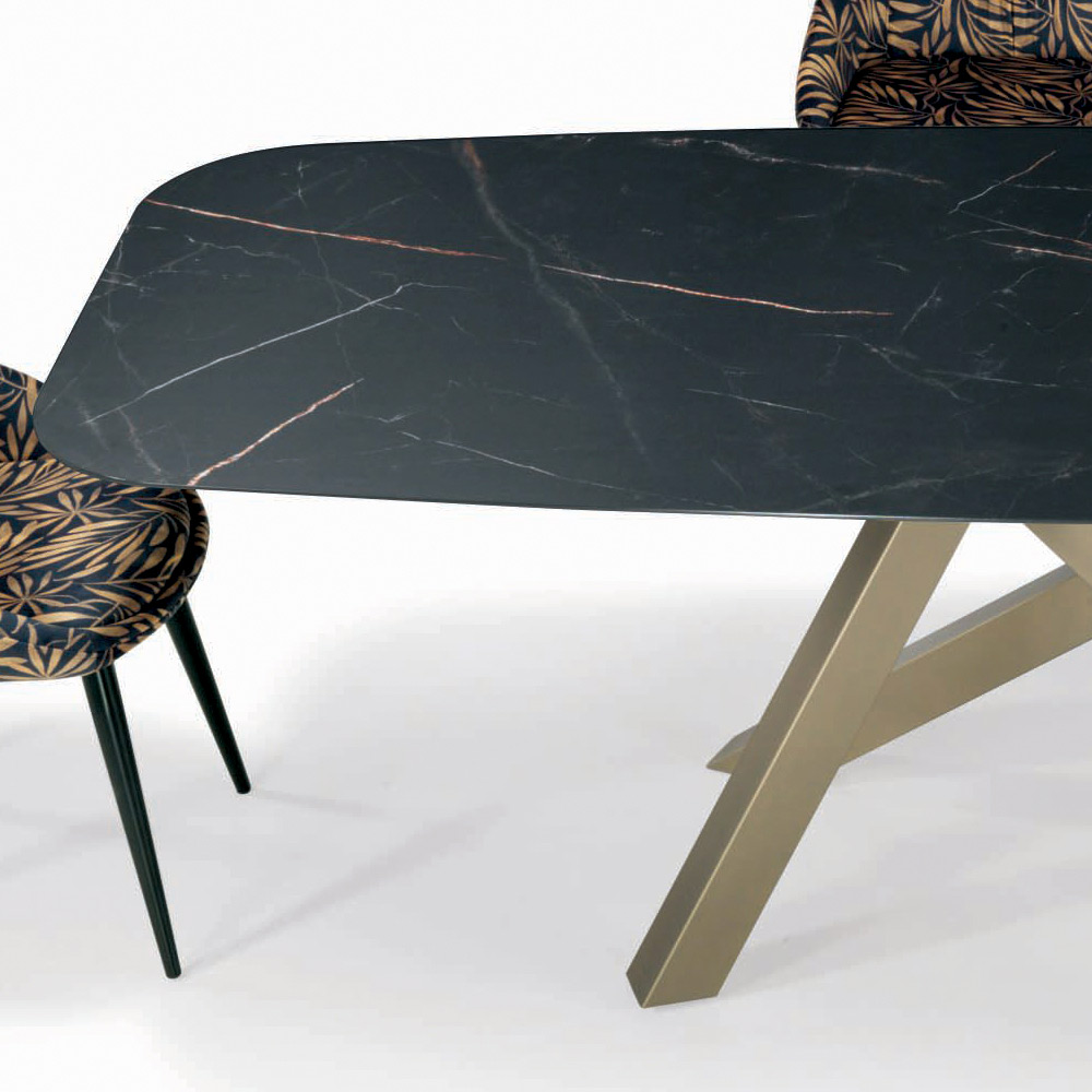 Tavolinë fikse e dhomës së ndenjes me majë të petëzuar në formë fuçi, buzë të pjerrëta 30° , bazë çeliku e lakuar me shampanjë me këmbë të rregullueshme. Stili dhe eleganca moderne takohen në këtë produkt i cili plotëson dhe e bën unik çdo ambient shtëpiak dhe kontraktor. Falë përfundimeve dhe materialeve të zgjedhura, e gjithë cilësia e Made in Italy është e garantuar dhe një produkt jo vetëm i bukur, por edhe funksional dhe praktik.