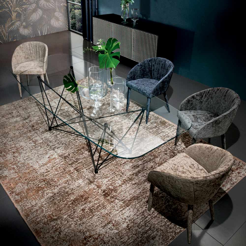Tavolinë fikse e dhomës së ndenjes në formë fuçie me majë xhami transparente tepër të qartë, buzë të pjerrëta 30° , bazë çeliku e zezë e llakuar me këmbë të rregullueshme. Elementi karakteristik i këtij produkti është loja vizuale e linjave dhe formave të krijuara nga baza e çelikut e cila i jep tavolinës lëvizje dhe origjinalitet . Kjo mobilie është e përkryer për të gjithë ata që duan të arredojnë ambientin e tyre të jetesës ose të kontratës me një prekje të rafinuar dhe të rafinuar pa sakrifikuar funksionalitetin . Artizanët italianë donin të krijonin një tryezë jo vetëm të bukur për t'u parë, por edhe të përdorshme në raste të ndryshme.