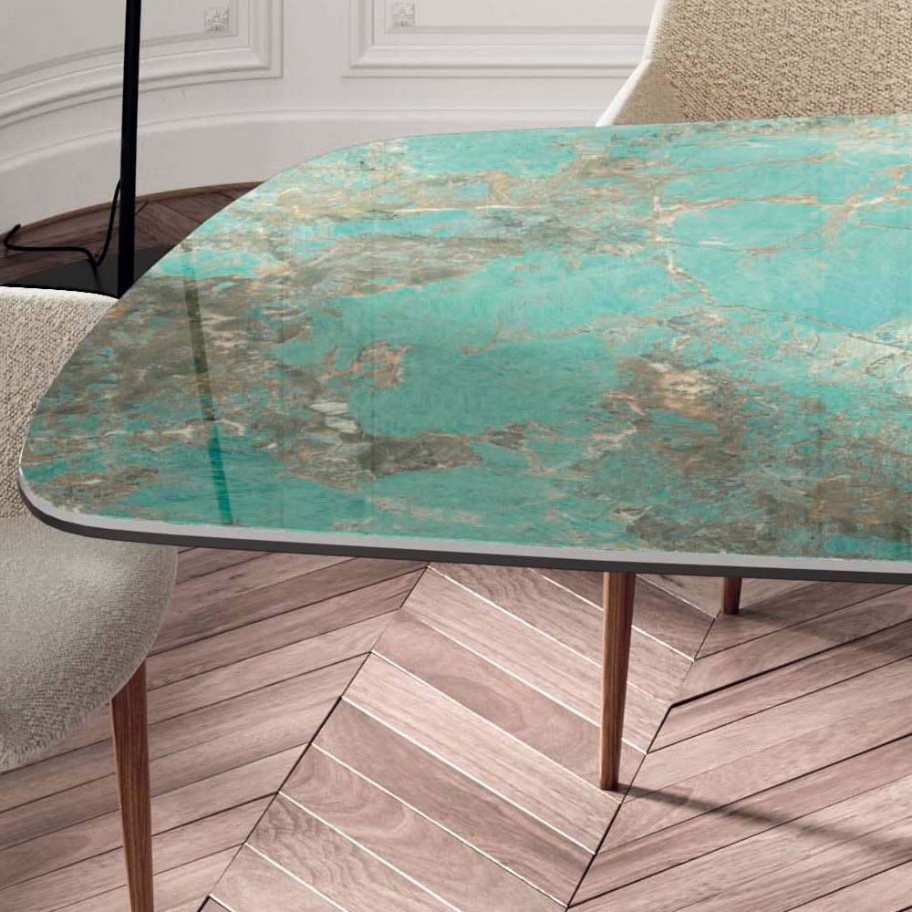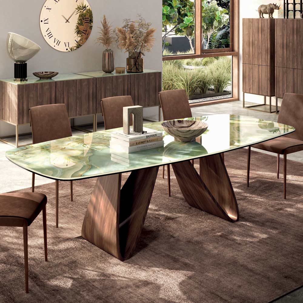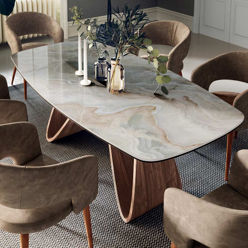 Tavolinë fikse e dhomës së ndenjes në formë fuçie me majë qeramike , buzë të pjerrëta 45° , bazë prej druri të rimeso Canaletto dhe këmbë të rregullueshme. Falë formës së bazës dhe veshjeve të sipërme të disponueshme, tavolina është në gjendje t'i japë një prekje lëvizjeje dhe elegance çdo ambienti të përditshëm dhe kontraktues. Materialet garantojnë funksionalitet dhe prakticitet për të pasur një produkt jo vetëm shumë të bukur nga ana vizuale, por edhe i përdorshëm në çdo rast.