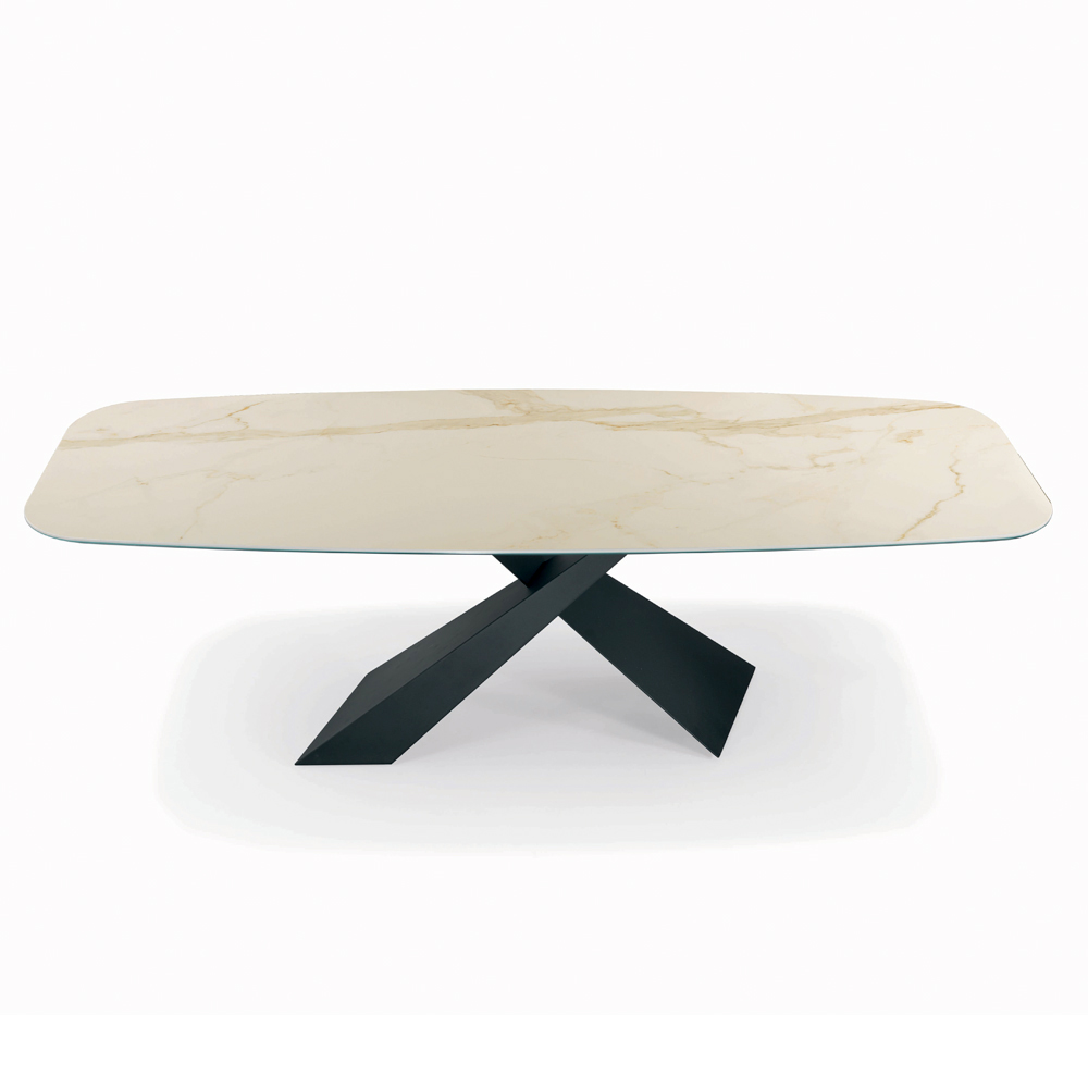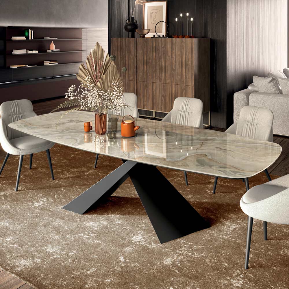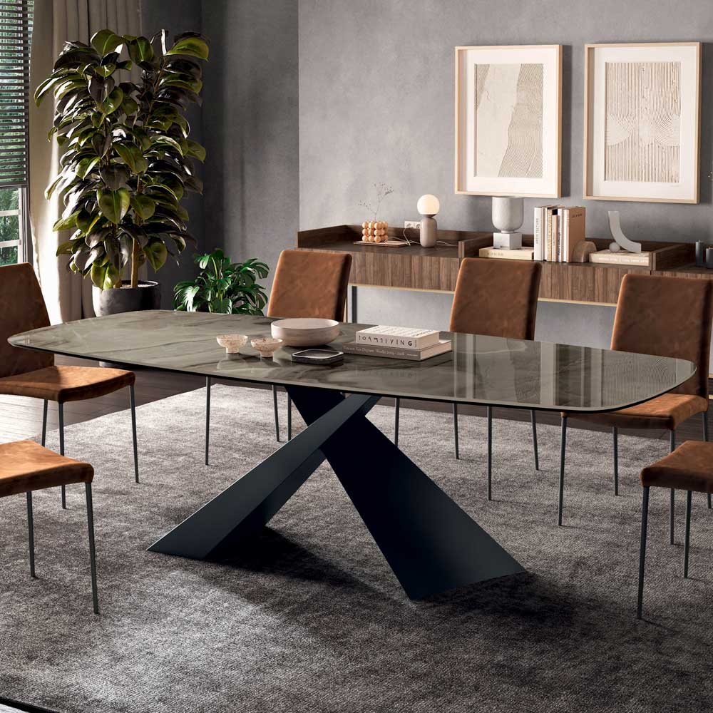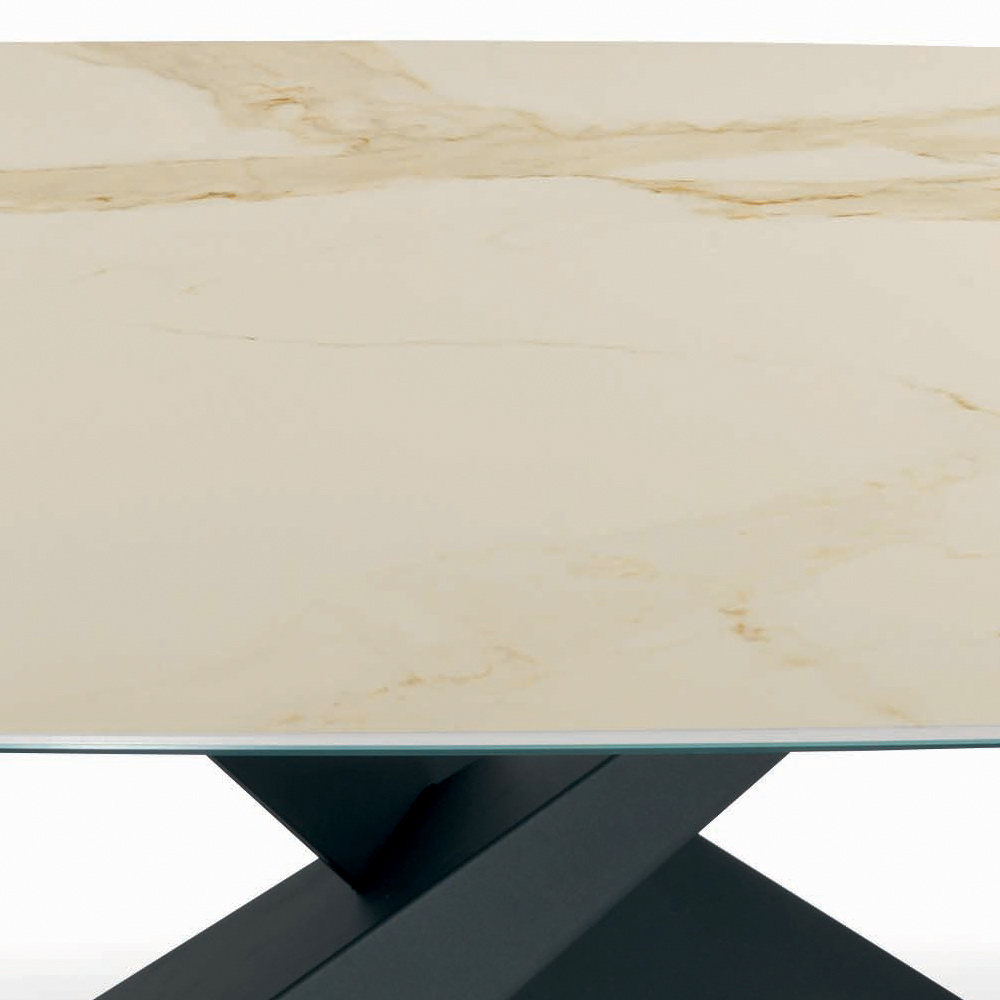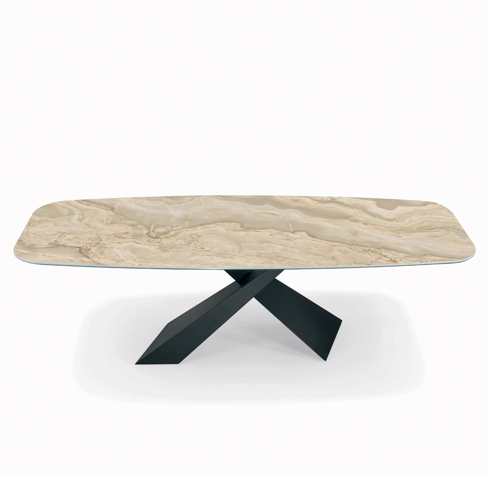 Tavolinë fikse e dhomës së ndenjes në formë fuçie me majë qeramike , buzë të pjerrëta 45° , bazë çeliku të llakuar me ngjyrë të zezë dhe këmbë të rregullueshme. Forma e pazakontë X e bazës i jep tryezës një prekje unike dhe të rafinuar që është e përshtatshme për personalizimin dhe kompletimin e arredimit të çdo ambienti të përditshëm dhe me kontratë.Materialet e cilësisë së shkëlqyer dhe saktësia në prodhim janë cilësitë e kësaj tavoline e cila garanton të gjithë funksionalitetin e Made in Italy.