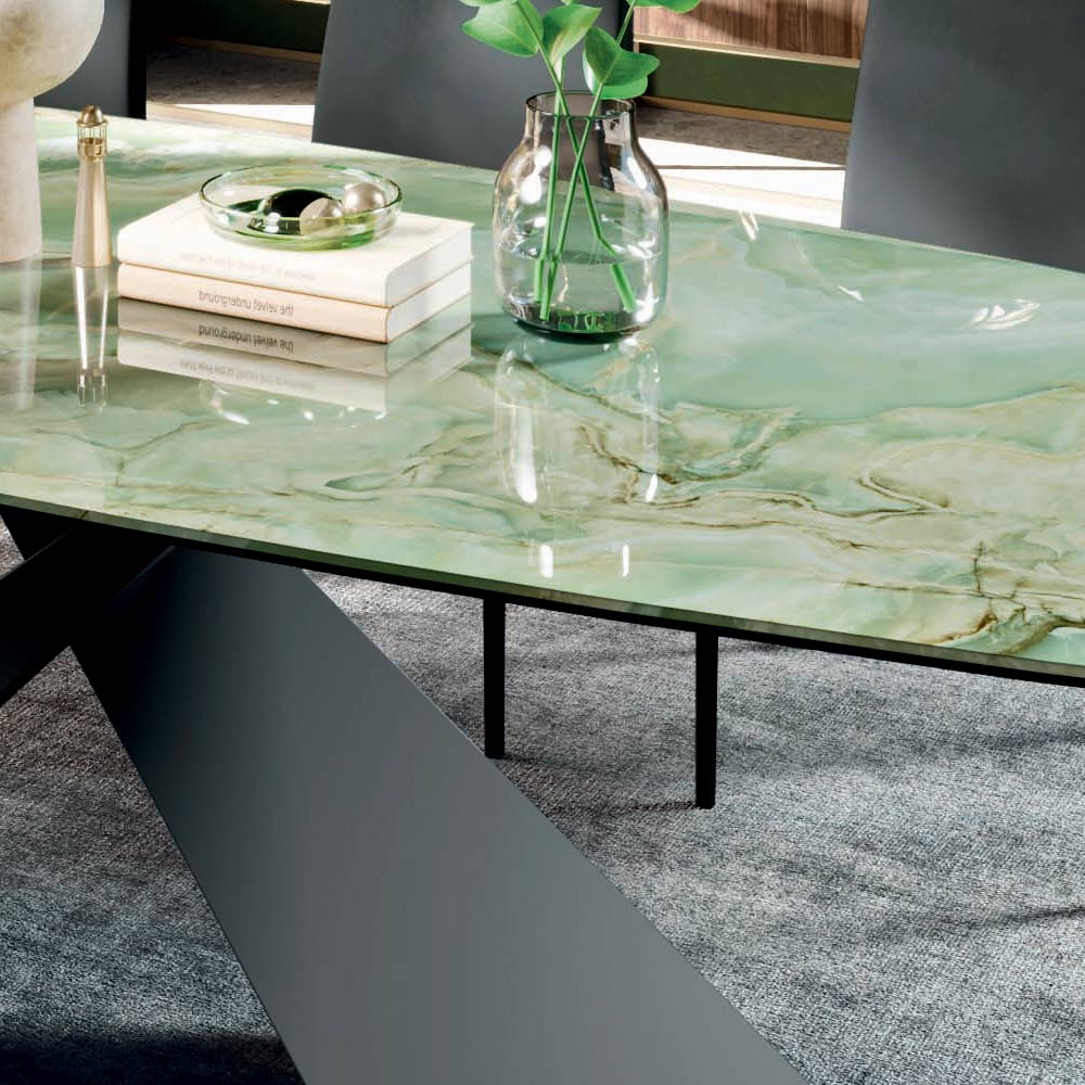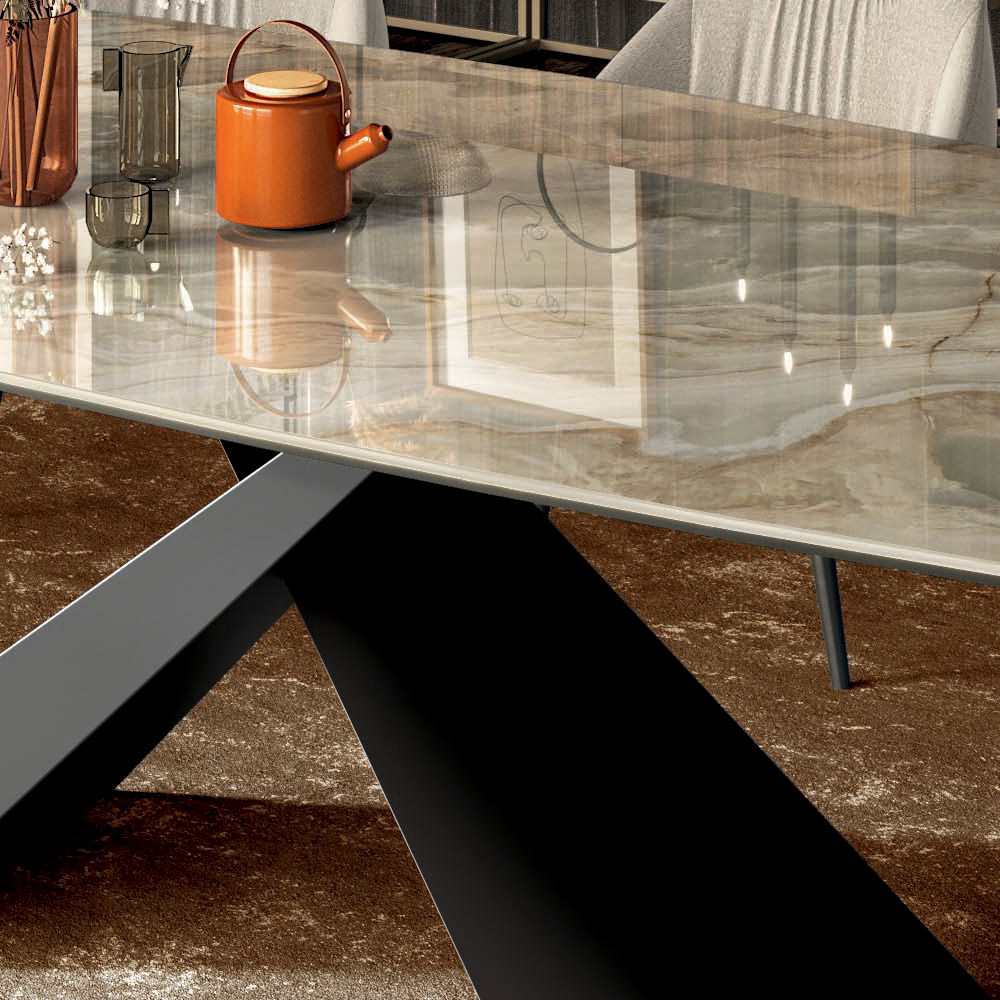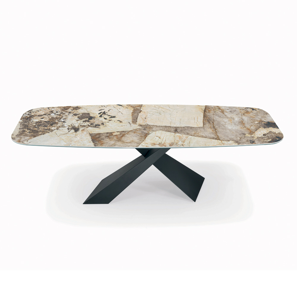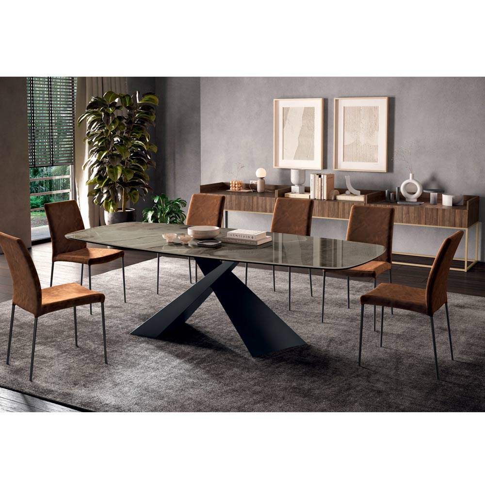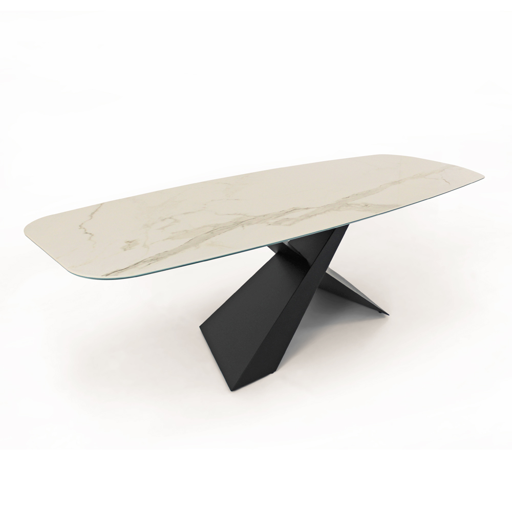 Tavolinë fikse e dhomës së ndenjes në formë fuçie me majë qeramike , buzë të pjerrëta 45° , bazë çeliku të llakuar me ngjyrë të zezë dhe këmbë të rregullueshme. Forma e pazakontë X e bazës i jep tryezës një prekje unike dhe të rafinuar që është e përshtatshme për personalizimin dhe kompletimin e arredimit të çdo ambienti të përditshëm dhe me kontratë.Materialet e cilësisë së shkëlqyer dhe saktësia në prodhim janë cilësitë e kësaj tavoline e cila garanton të gjithë funksionalitetin e Made in Italy.