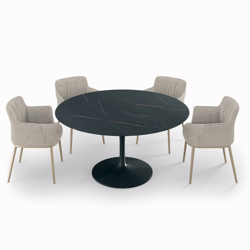 Tavolinë fikse e dhomës së ndenjes me pjesën e sipërme të laminuar me fije mat noir desir, buzë të pjerrëta 45° , bazë prej alumini të derdhur me llak të zi me shkëlqim. Zinxhiri i produkteve, nga konceptimi në prodhim, deri në kontrollin e cilësisë, kryhet tërësisht në Itali , për të garantuar dhe ruajtur karakteristikën tipike të "know-how" italian dhe rëndësinë e tipike Made in Italy. Ky produkt me një stil modern ka objektivin kryesor që të mund të përdoret çdo ditë pa sakrifikuar dizajnin.