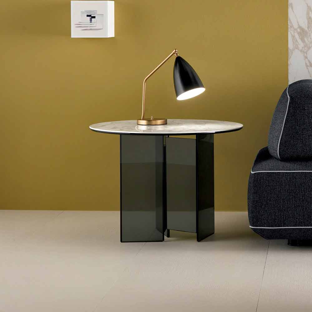 Bërë nga xhami i tymosur për bazën dhe një majë qeramike arabesk kalacatta e lëmuar , është një pjesë mobiljesh e punuar me dorë në Itali me materiale me cilësi të lartë ideale për zonën e banimit.