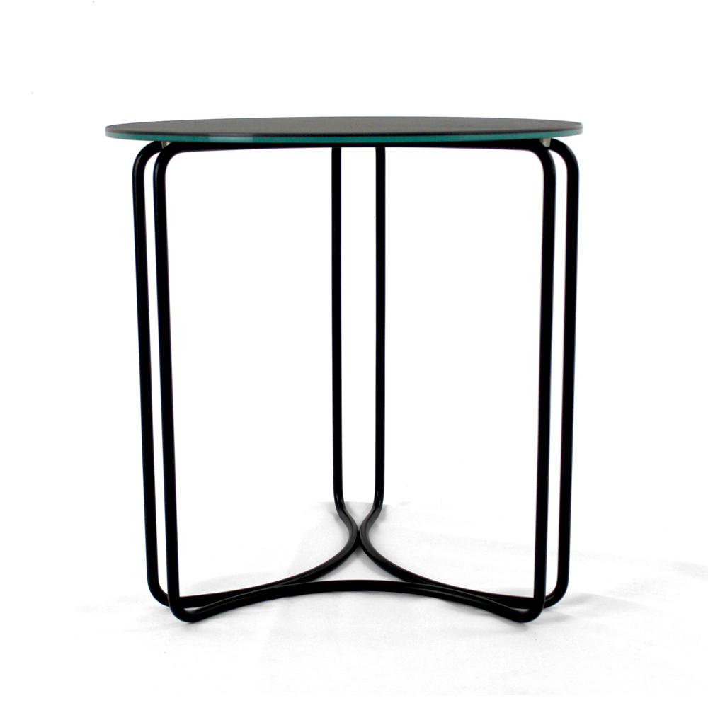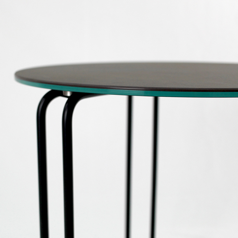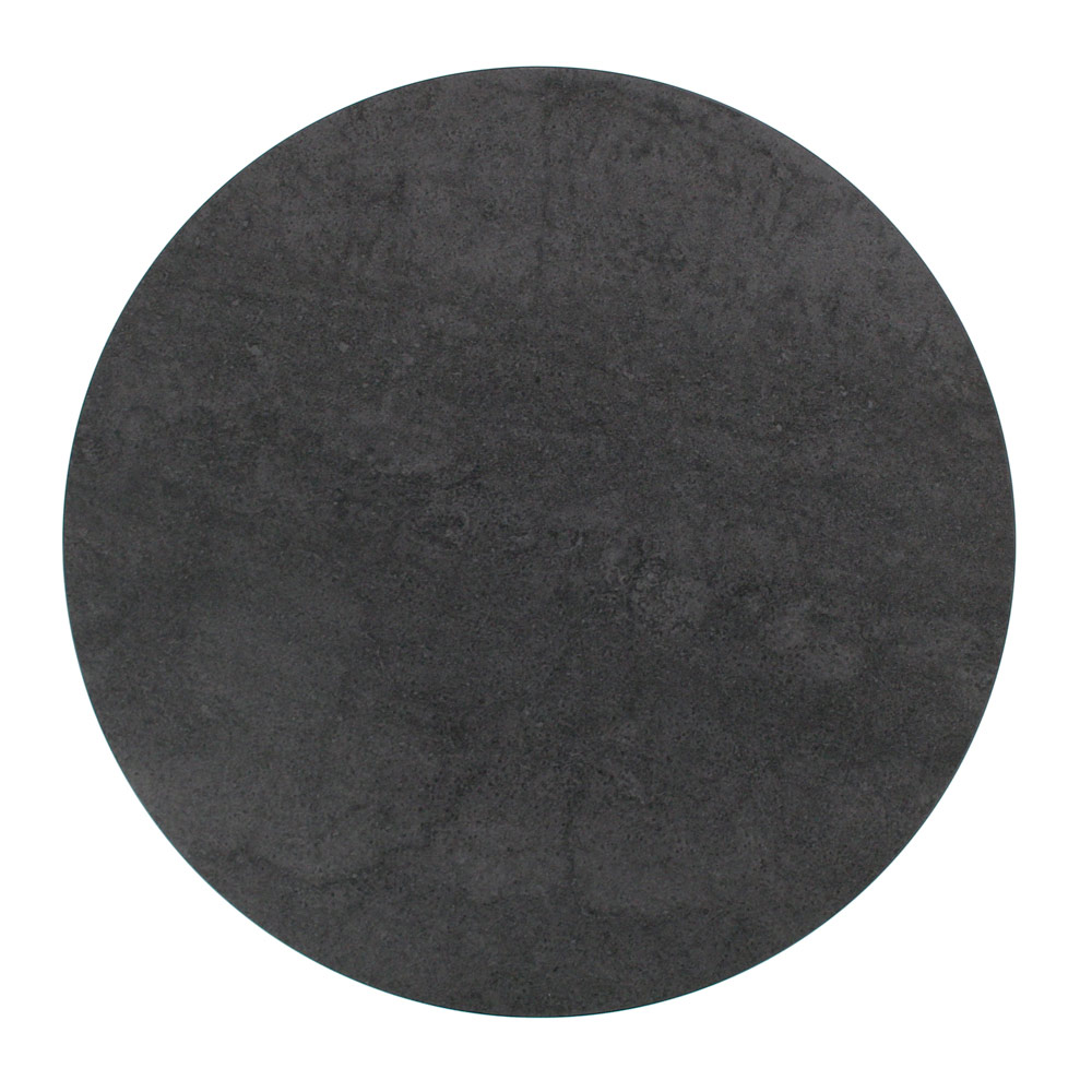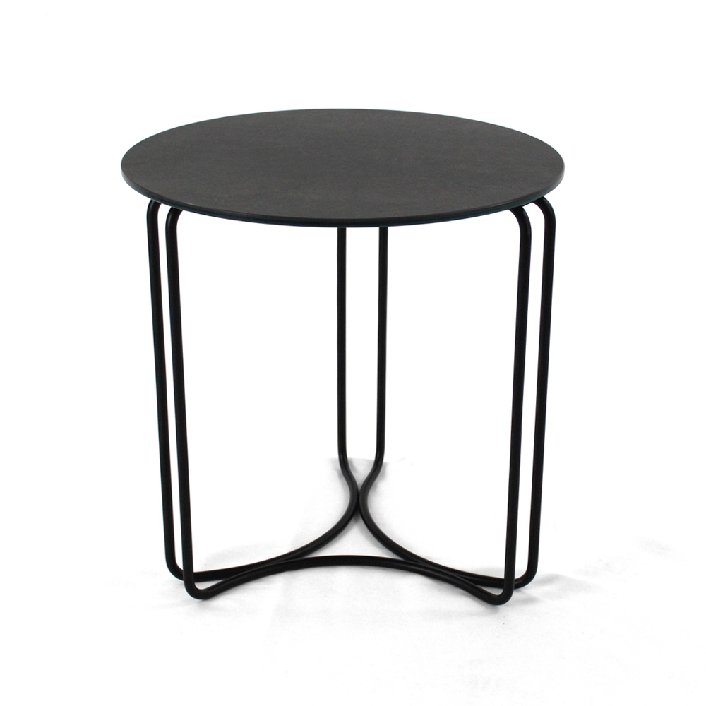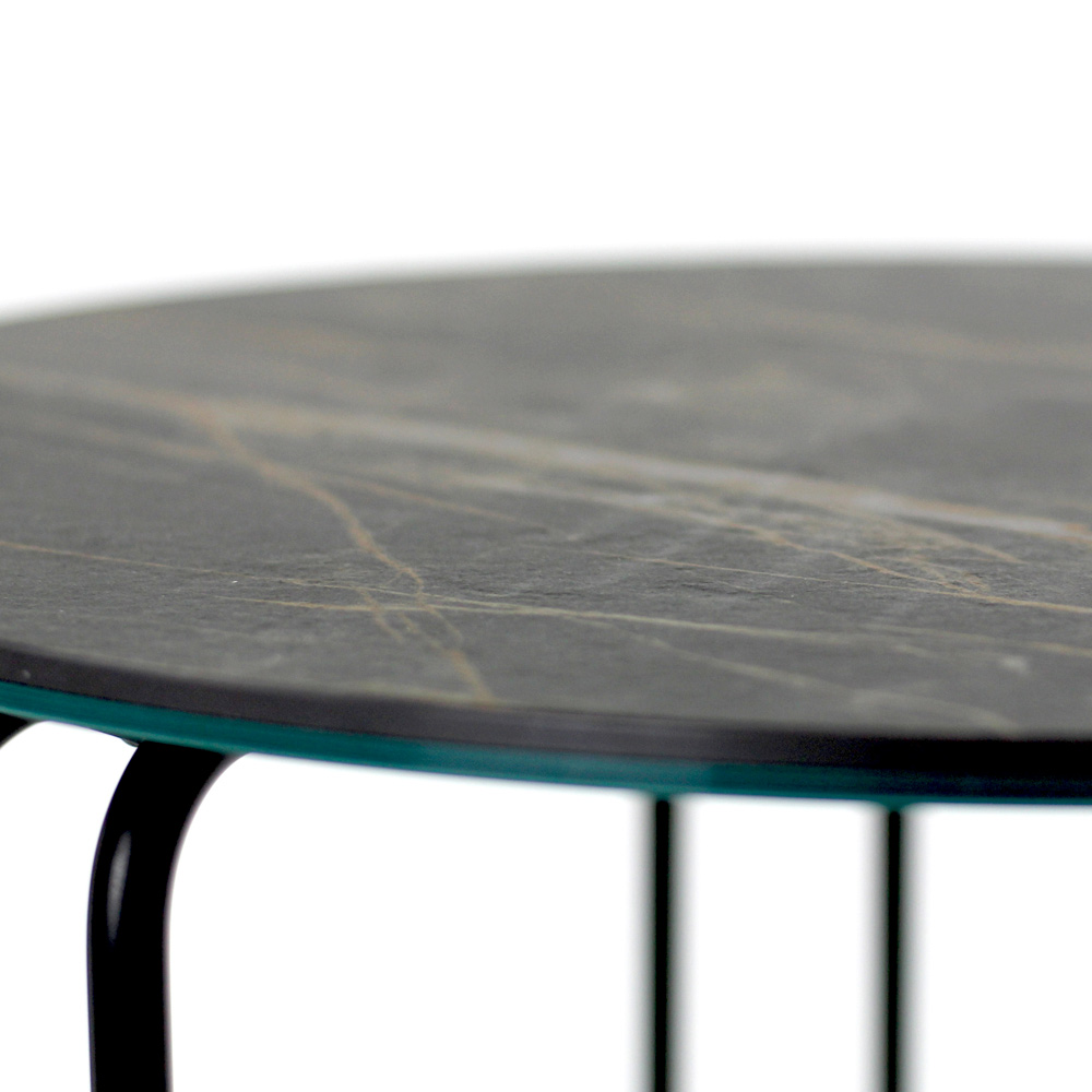 Tavolinë e rrumbullakët me bazë çeliku të lyer dhe maja e gurit prej porcelani.