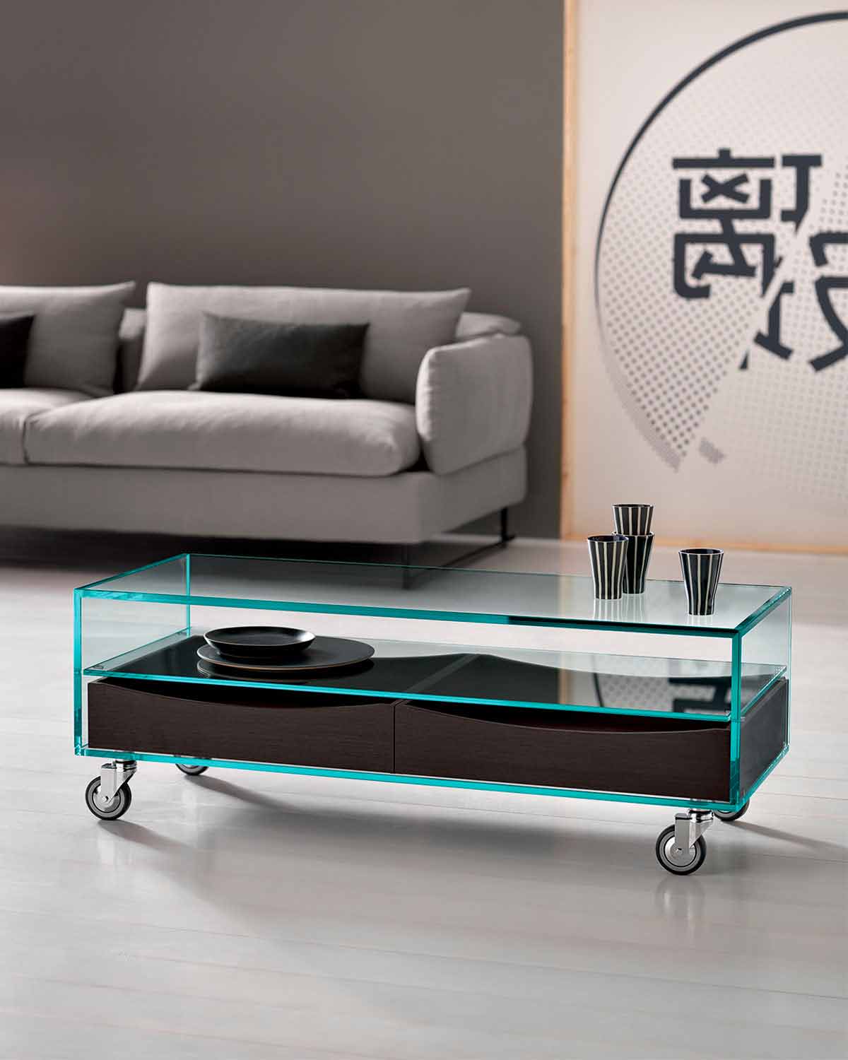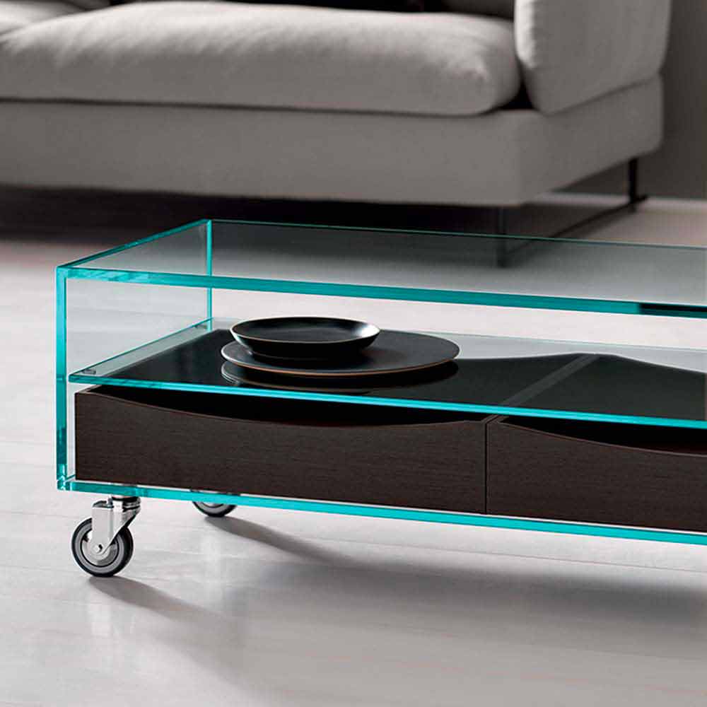 Tavolinë kafeje e dhomës së ndenjes në stile moderne në rrota në xham ekstraslear me dy sirtarë druri wengè, Made in Italy.