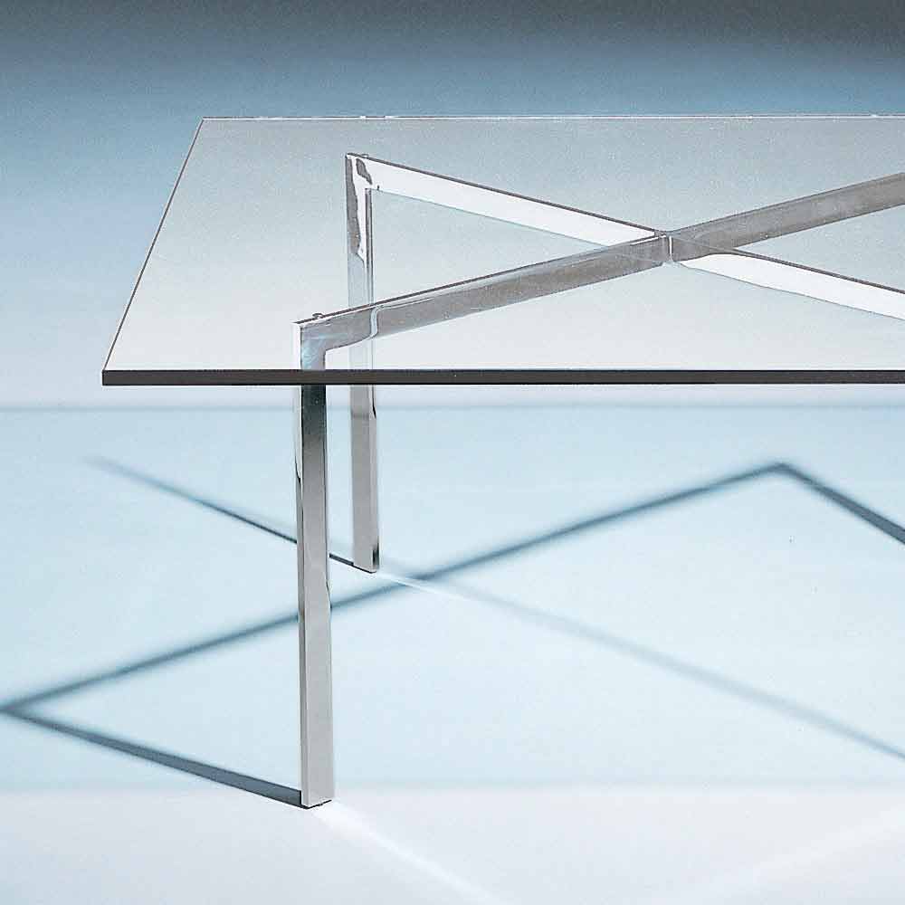 Tavolinë katrore kafeje me majë qelqi të trashë (e trashë 5 mm) dhe bazë çeliku të kromuar . Një aksesor mobilues i prodhuar nga një prodhim 100% i prodhuar në Itali, i karakterizuar nga elementë të tillë si thjeshtësia dhe dizajni që i lejojnë atij të pushtojë çdo zonë jetese me një stil bashkëkohorfalë personalitetit të tij të gjithanshëm dhe thelbësisë së tij ekstreme. Veçoritë e tij përfaqësohen nga pjesa e sipërme e xhamit e cila i jep estetikës së produktit elegancë dhe karakter dhe nga baza e çelikut e cila siguron një produkt të fortë dhe rezistent falë përdorimit të materialeve cilësore . Rezultati është një tavolinë kafeje e matur dhe elegante e aftë të karakterizojë çdo situatë stilistike me një prekje ekskluzive dhe të rafinuar .