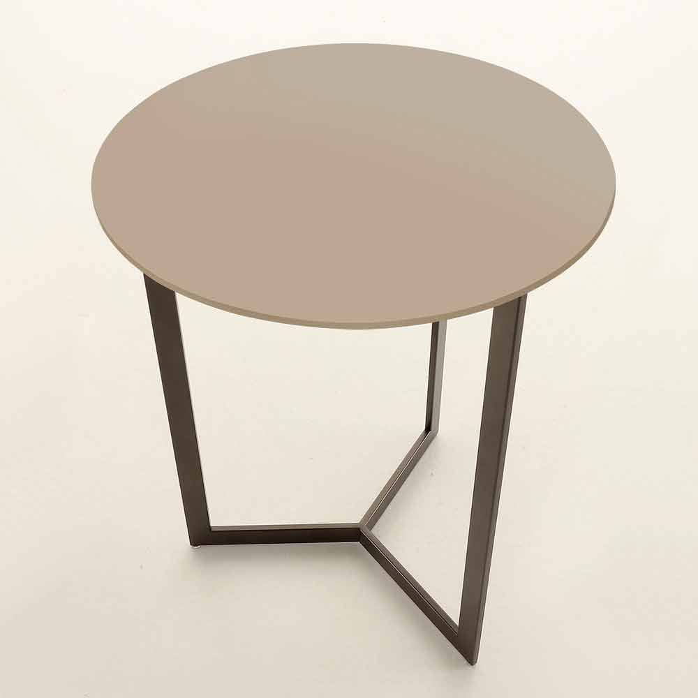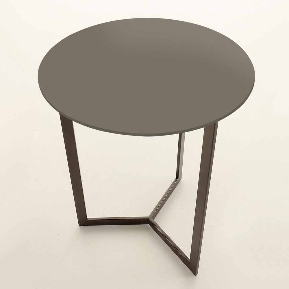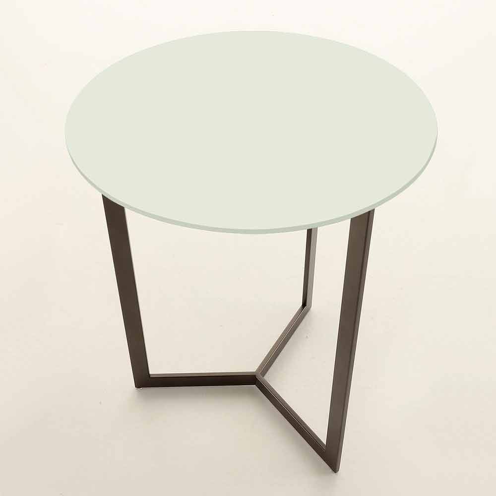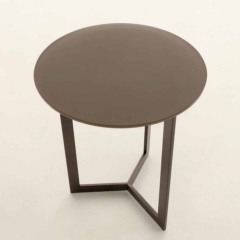 Tavolinë kafeje e thjeshtë dhe elegante e prodhuar në Itali me majë të rrumbullakët në xham sateni anti-gjurmë gishtash dhe strukturë në metal të ngjyrosur në të kaftë.
