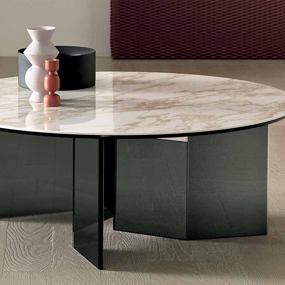 Bërë nga xhami i tymosur për bazën dhe një majë qeramike arabesk kalacatta e lëmuar , është një pjesë mobiljesh e punuar me dorë në Itali me materiale me cilësi të lartë ideale për zonën e banimit.