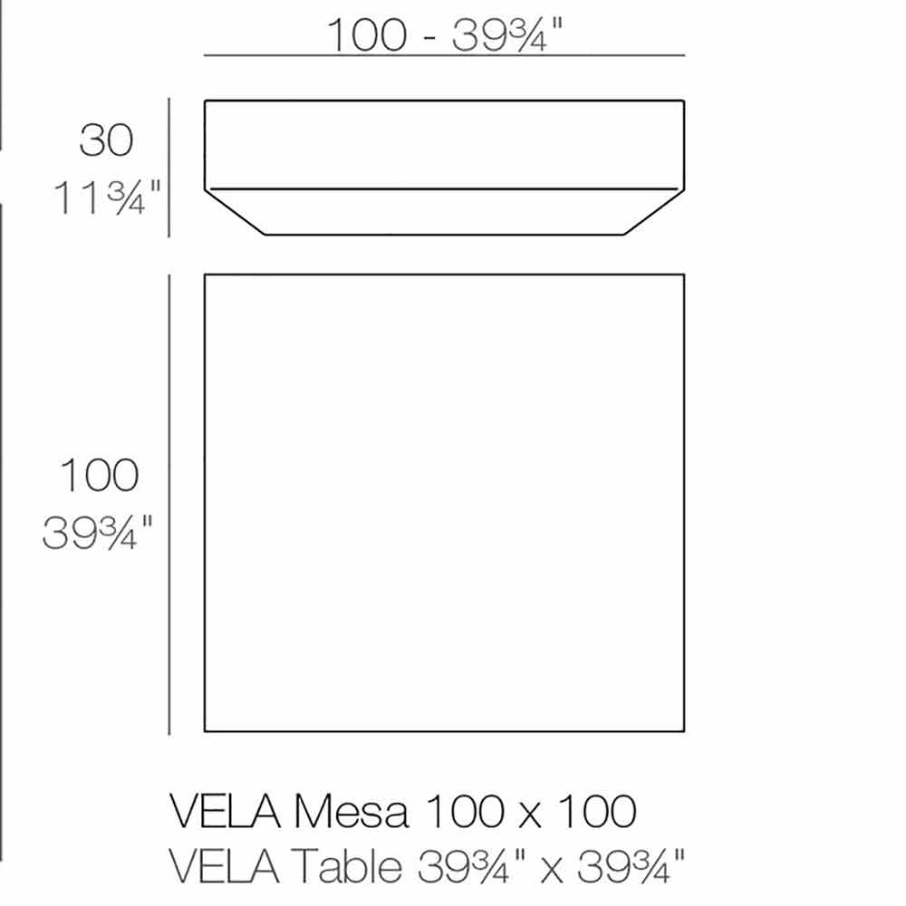 Tavolinë kafeje moderne koleksion Vela nga Vondom, në polietileni Koleksioni Vela u dizenjua nga projektuesi Ramòn Esteve. Ky koleksion i gjerë i mobiljeve në natyrë synon të ofrojë komoditetin dhe cilësinë e mobiljeve të brendshme pa humbur cilësitë e tij origjinale. Vela është një sistem modular me një gjeometri elementare prizmatike që e bazon veçantinë e saj në ekuilibrin e proporcioneve të saj. Tavolina e kafesë ka linja precize dhe të pastra. Materiali i përdorur është polietileni, rezistent ndaj goditjeve dhe rrezeve UV. E disponueshme në ngjyrat e mëposhtme: e bardhë, e zezë, akull, çelik, antracit, taupe, ecrù, bezhë, fëstëk, vjollcë, e kuqe, portokalli, kaki, marinë dhe bronz.