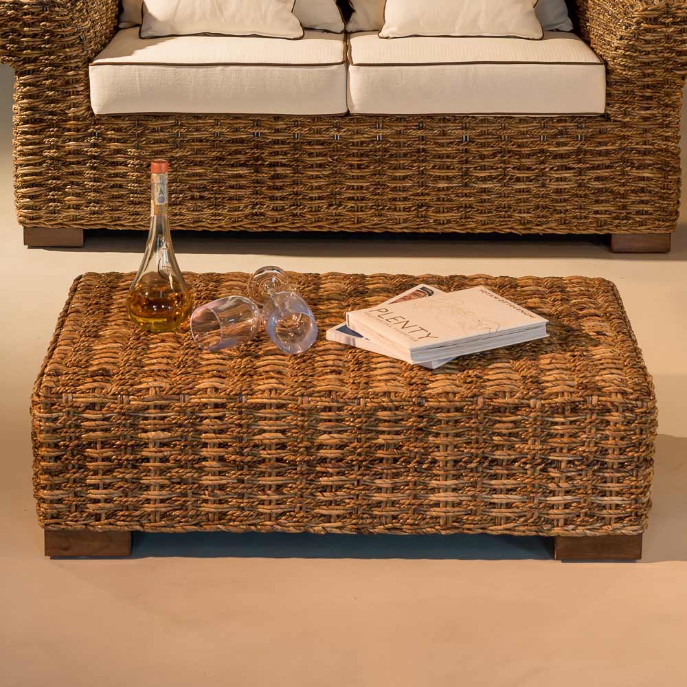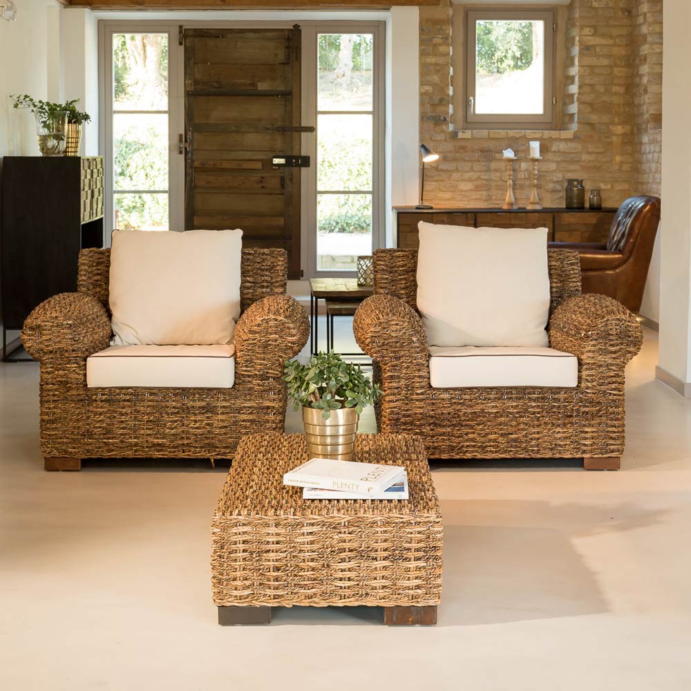 Tavolinë kafeje në natyrëbërëbërë nga fibranatyrale abaca e thurur me dorë . Tavolina e kafesë i përket një koleksioni të tërë e cila është bërë unike nga mbështetëset e rrumbullakosura cilindrike të krahëve dhe një thurje e dendur e rafinuar e fibrës natyraletë abacës , që rrjedh nga pema e bananes . Vendet janë të mëdha dhe të pajisura me jastëkë të rehatshëm . Produktet e këtij koleksioni janë të përshtatshme për mobilimin e hapësirave të jashtme të strehuara si veranda, ballkone, tarraca, veranda dhe belveder, duke gjallëruar ambientet me ngrohtësi dhe stil unik.