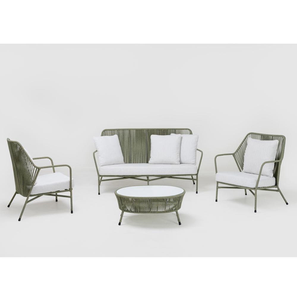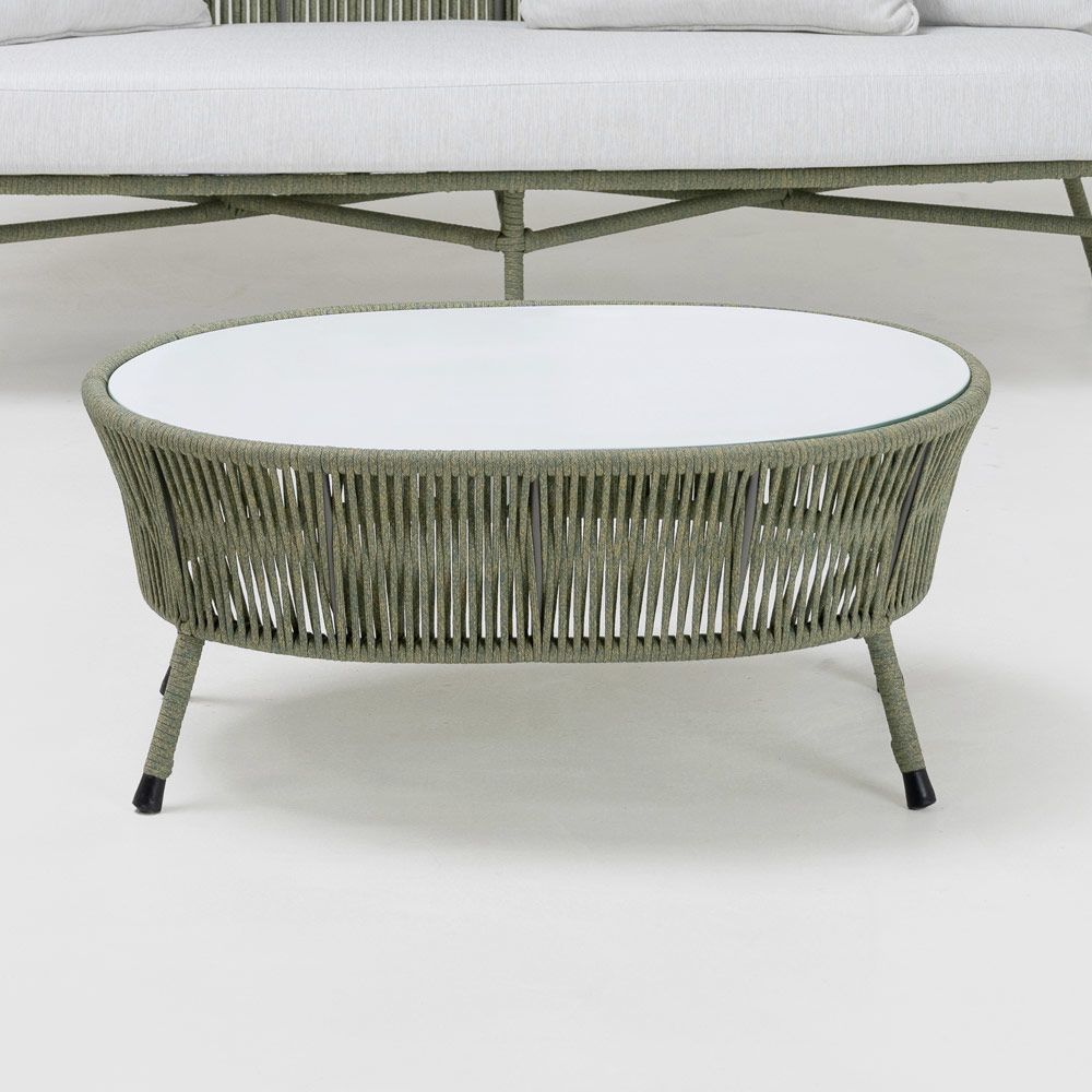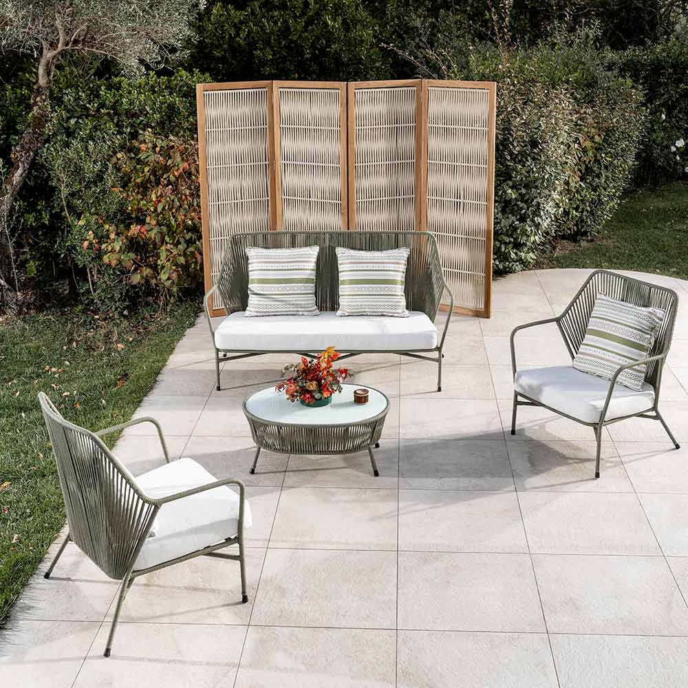 Kjo tavolinë kopshti është ideale për të shijuar hapësirat e jashtme. Dizajni i tij është bashkëkohor, me një strukturë të lehtë në litar të endur që krijon një lojë transparence dhe hijesh, duke shtuar thellësi dhe interes vizual në kopshtin ose tarracën tuaj.