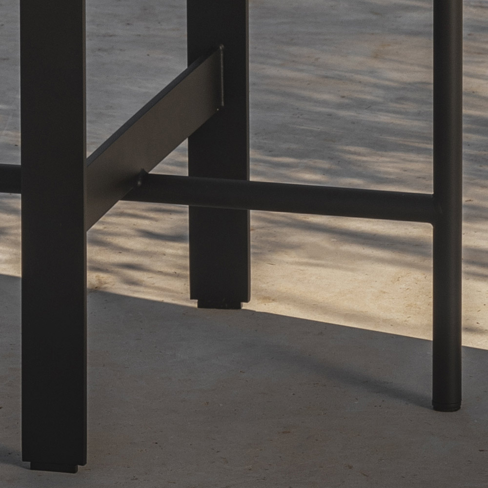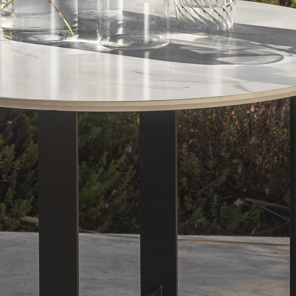 Pjesa e sipërme prej guri prej porcelani, përveçse krijon një efekt të mrekullueshëm elegant , e bën këtë tavolinë kafeje shumë kompakte dhe të gjithanshme, perfekte për të kompletuar me stil çdo situate të arredimit të jashtëm pa lënë në hije aspektin funksional.
