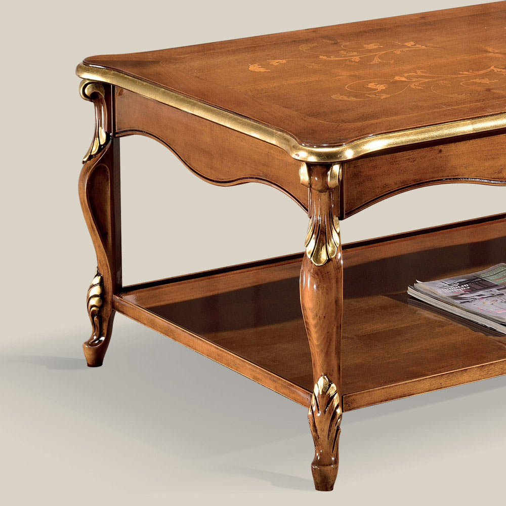 Tavolinë kafeje drejtkëndëshe prej arre Bassano dhe ari antik, me pjesën e sipërme të inkorporuar dhe raft praktik. Një komplement unik dhe i rafinuar, i bërë tërësisht në Itali nga mjeshtra të aftë , mjeshtër të artit që përfundojnë çdo komplement me mençuri dhe shije për elegancë. Prodhimi kryhet duke përdorur materiale të shkëlqyera , dhe duke kryer punënmedorë me kujdesin dhe profesionalizmin maksimal që i dallon produktet Made in Italy .