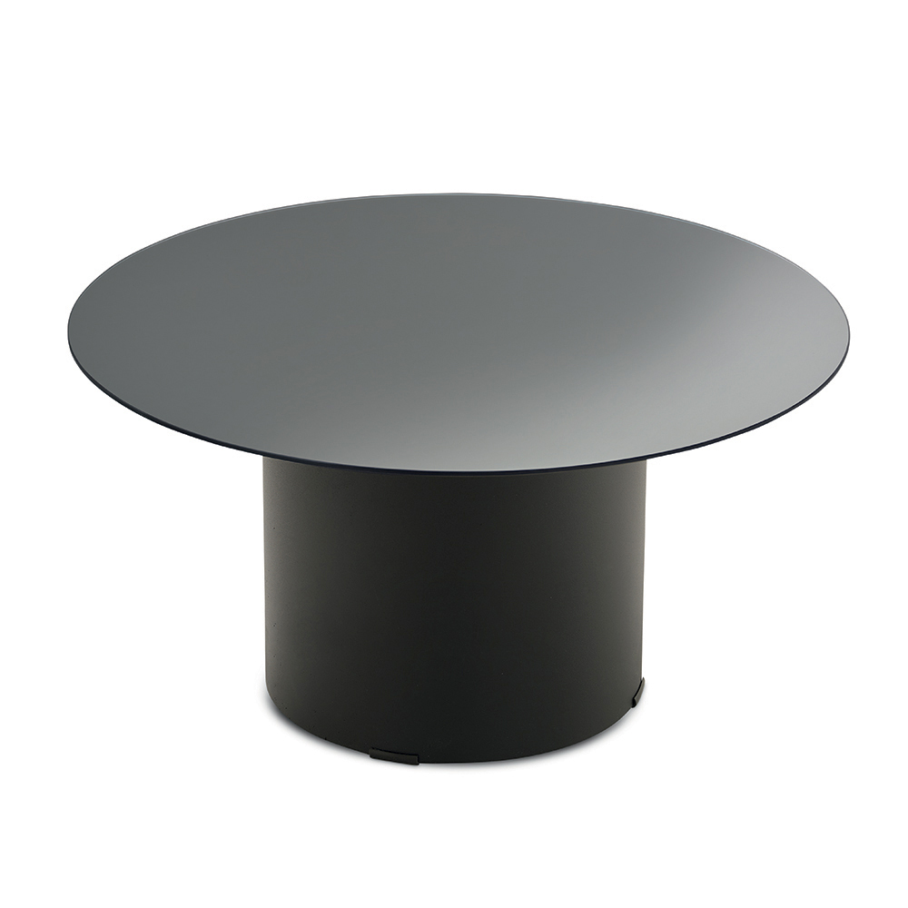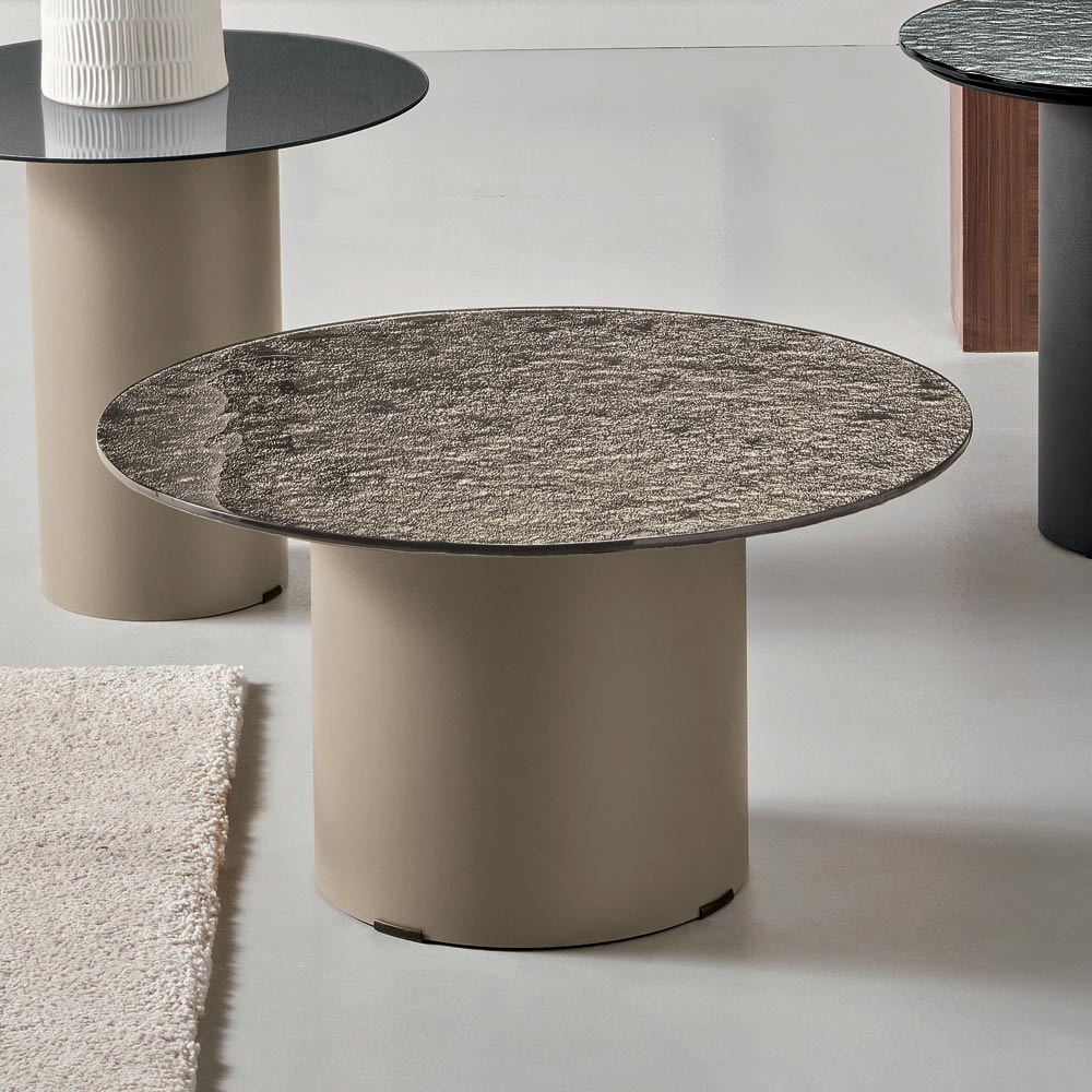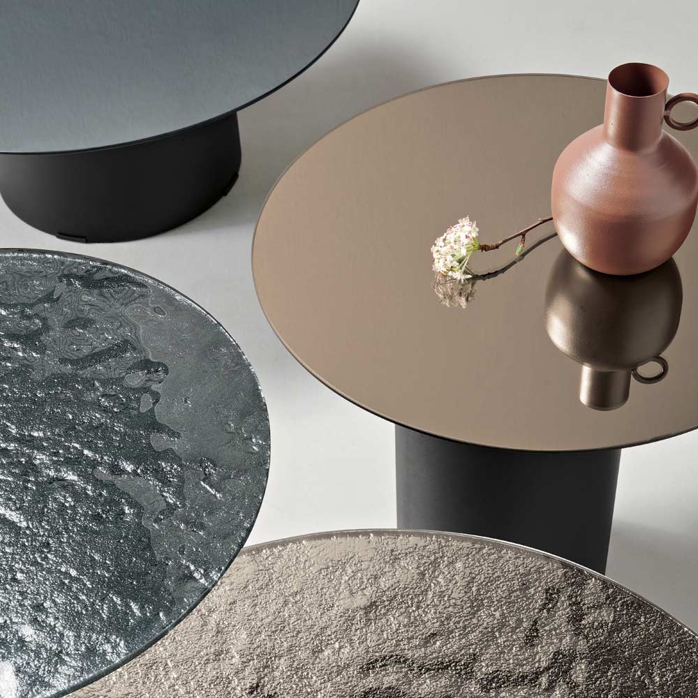 Tavolinë kafeje dizajni e prodhuar në Itali me bazë cilindrike metalike dhe sipërfaqe qelqi ose pasqyre
