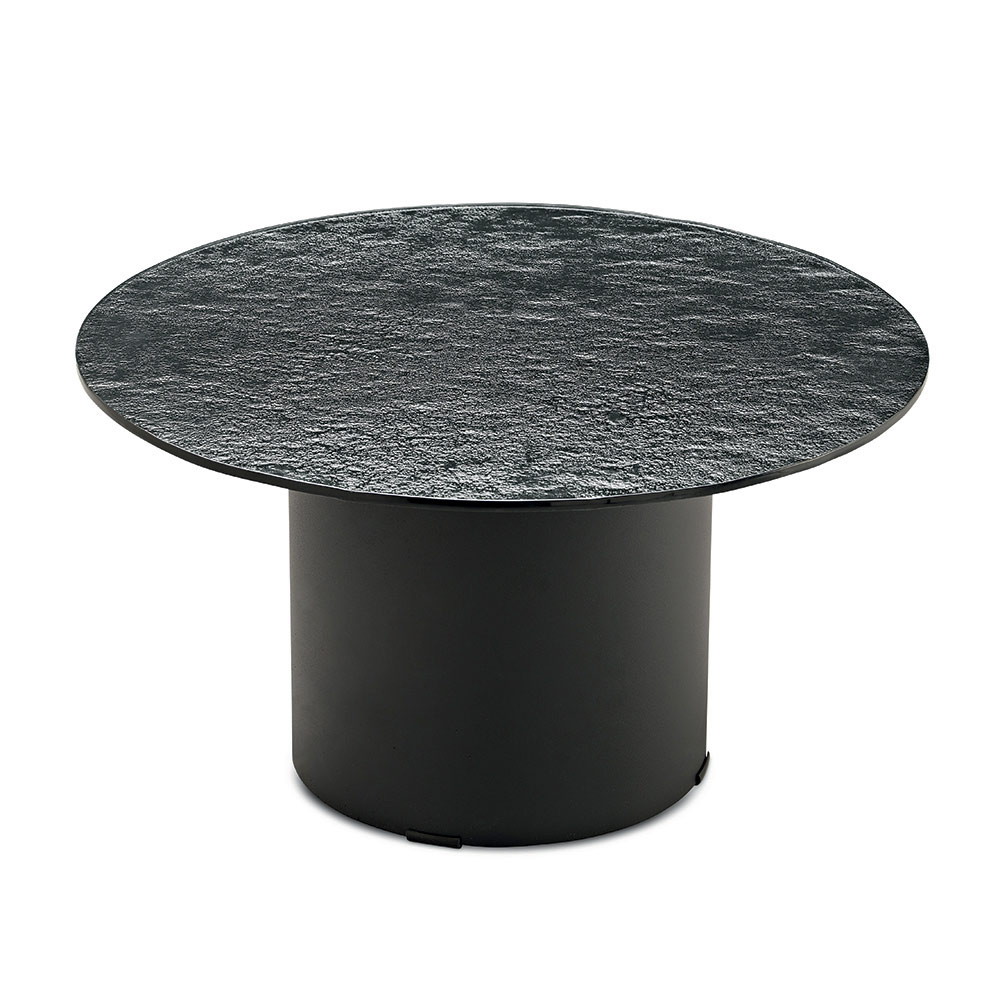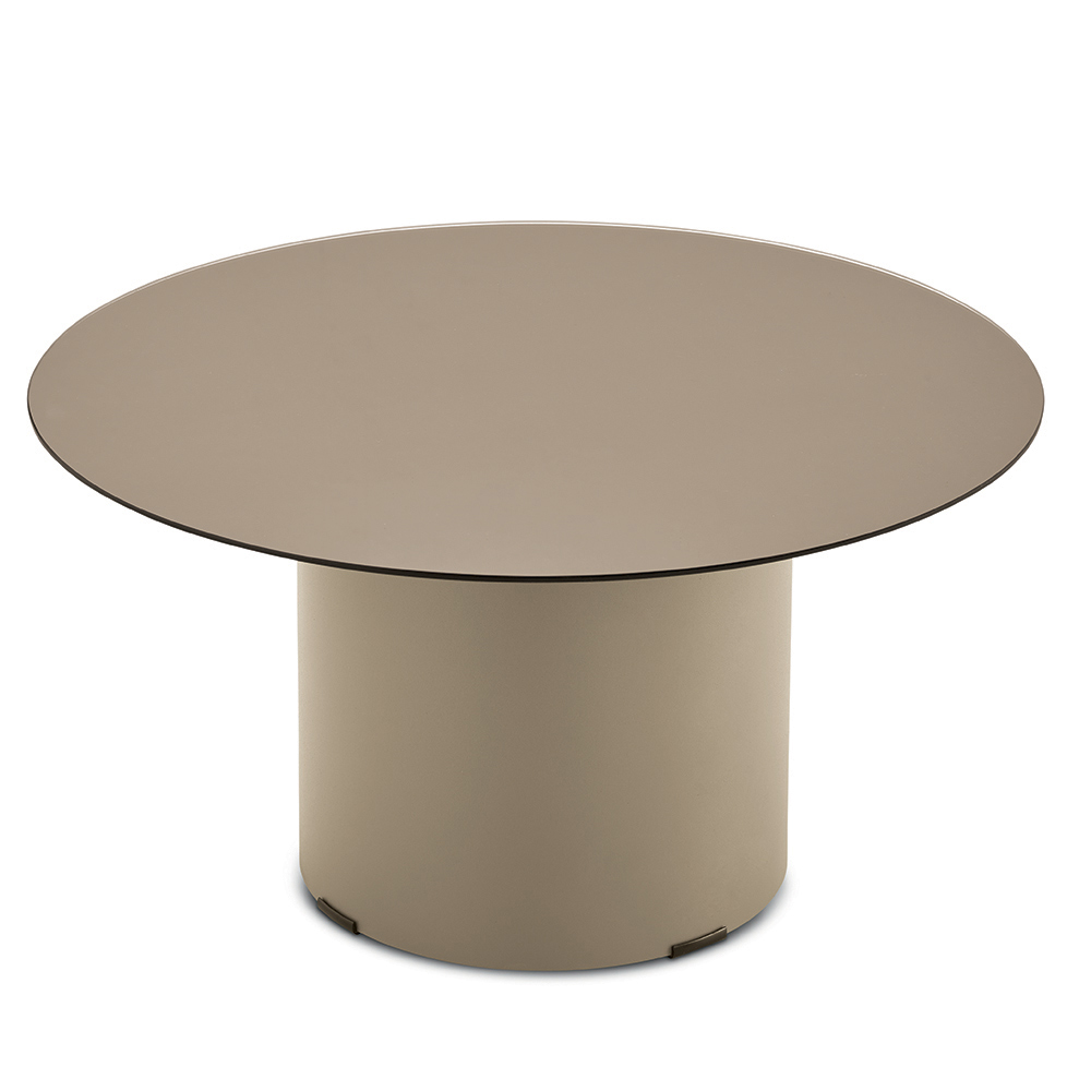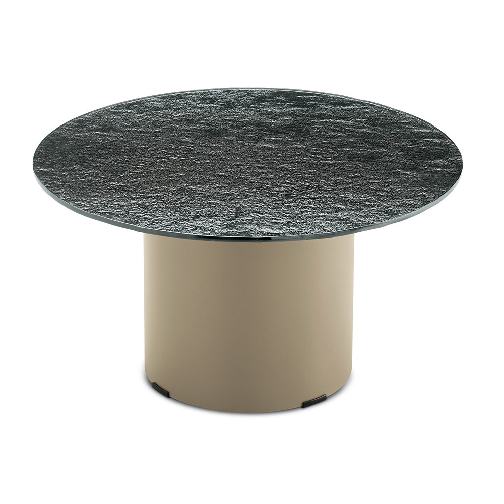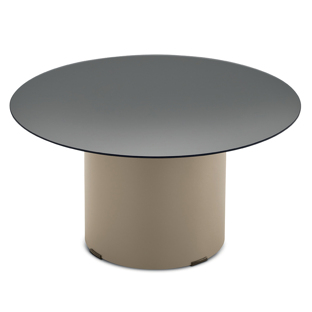 Tavolinë kafeje dizajni e prodhuar në Itali me bazë cilindrike metalike dhe sipërfaqe qelqi ose pasqyre