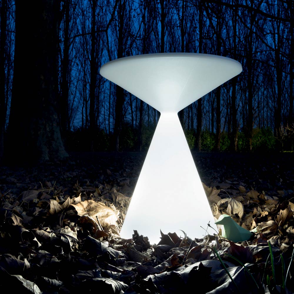 Tavolinë e rrumbullakët me dritë për ambiente të jashtme në polietileni dhe enë të brendshme prodhim Italie.