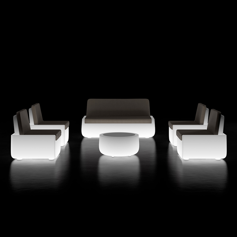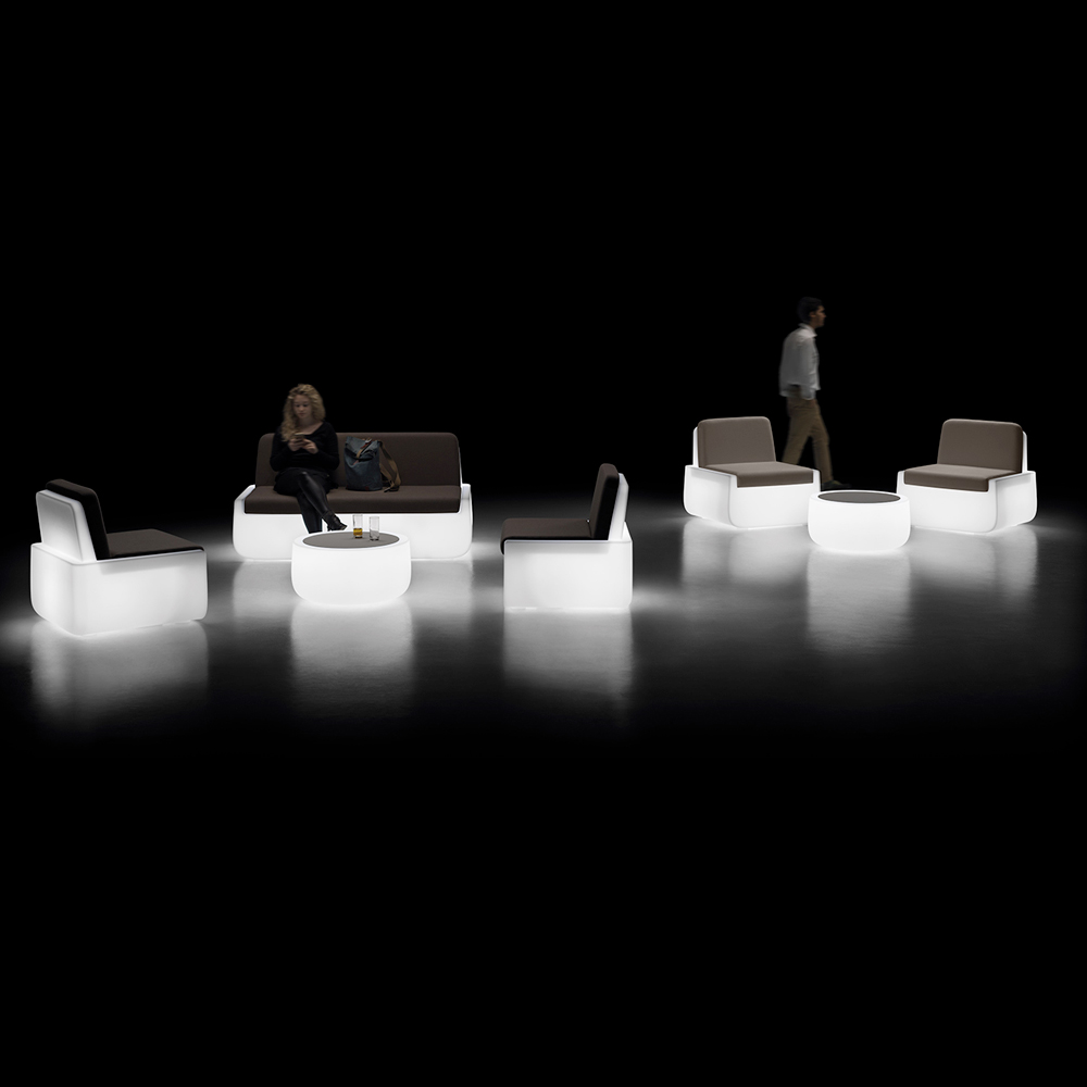 Tavolinë kafeje në natyrë me dizajn të ulët në polietileni me majë HPL dhe dritë LED Made in Italy.