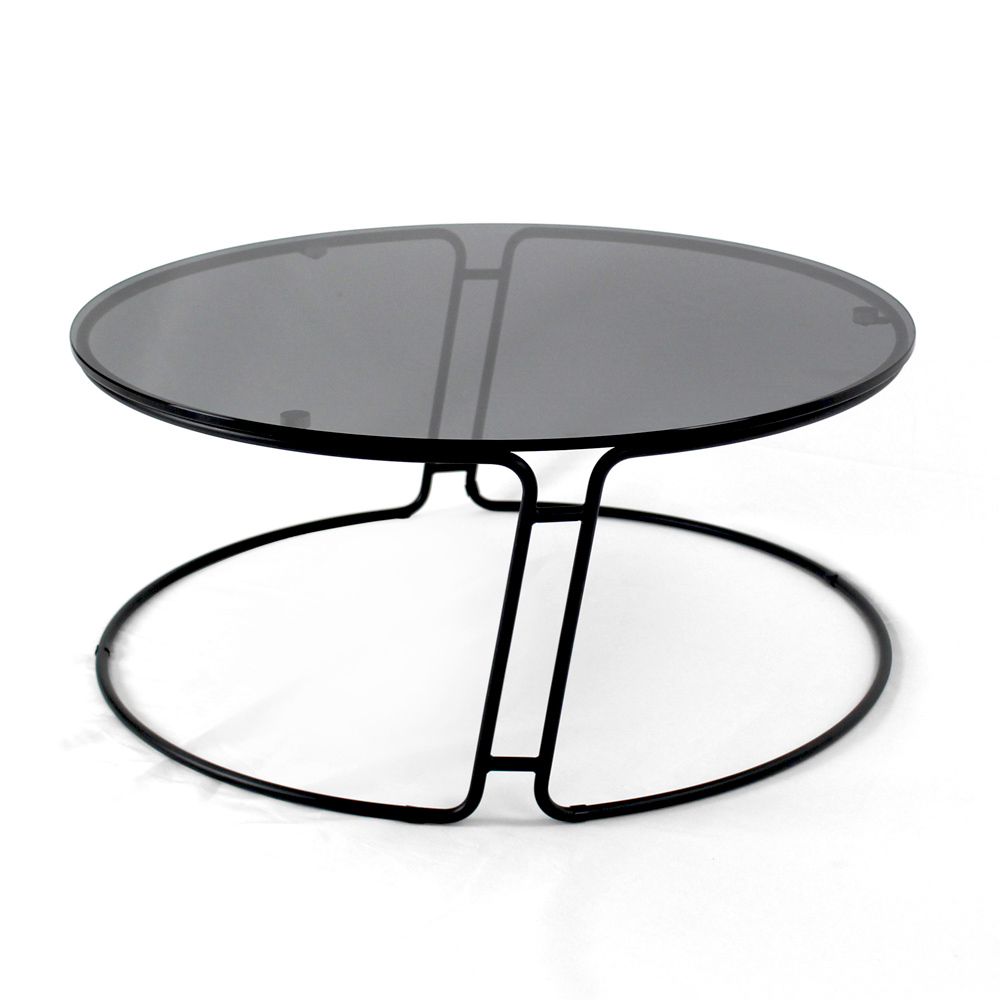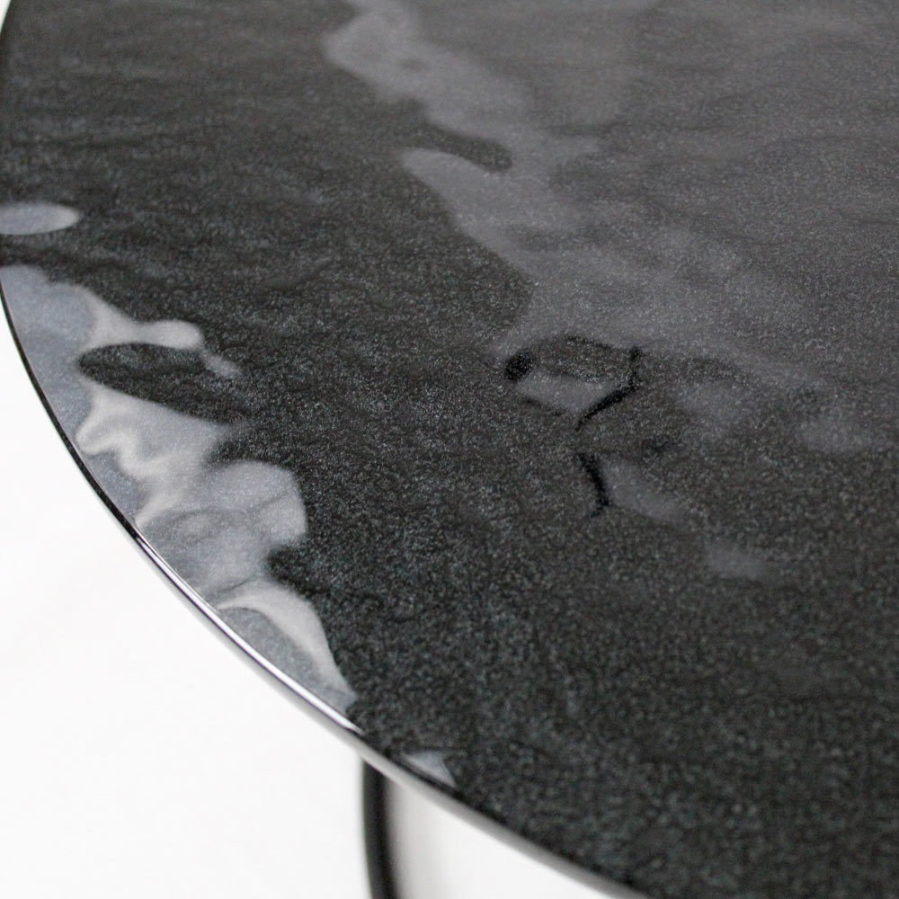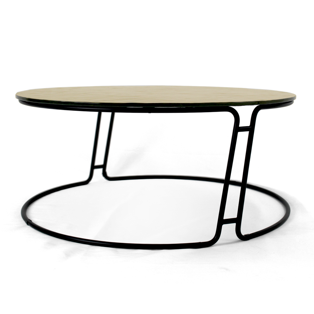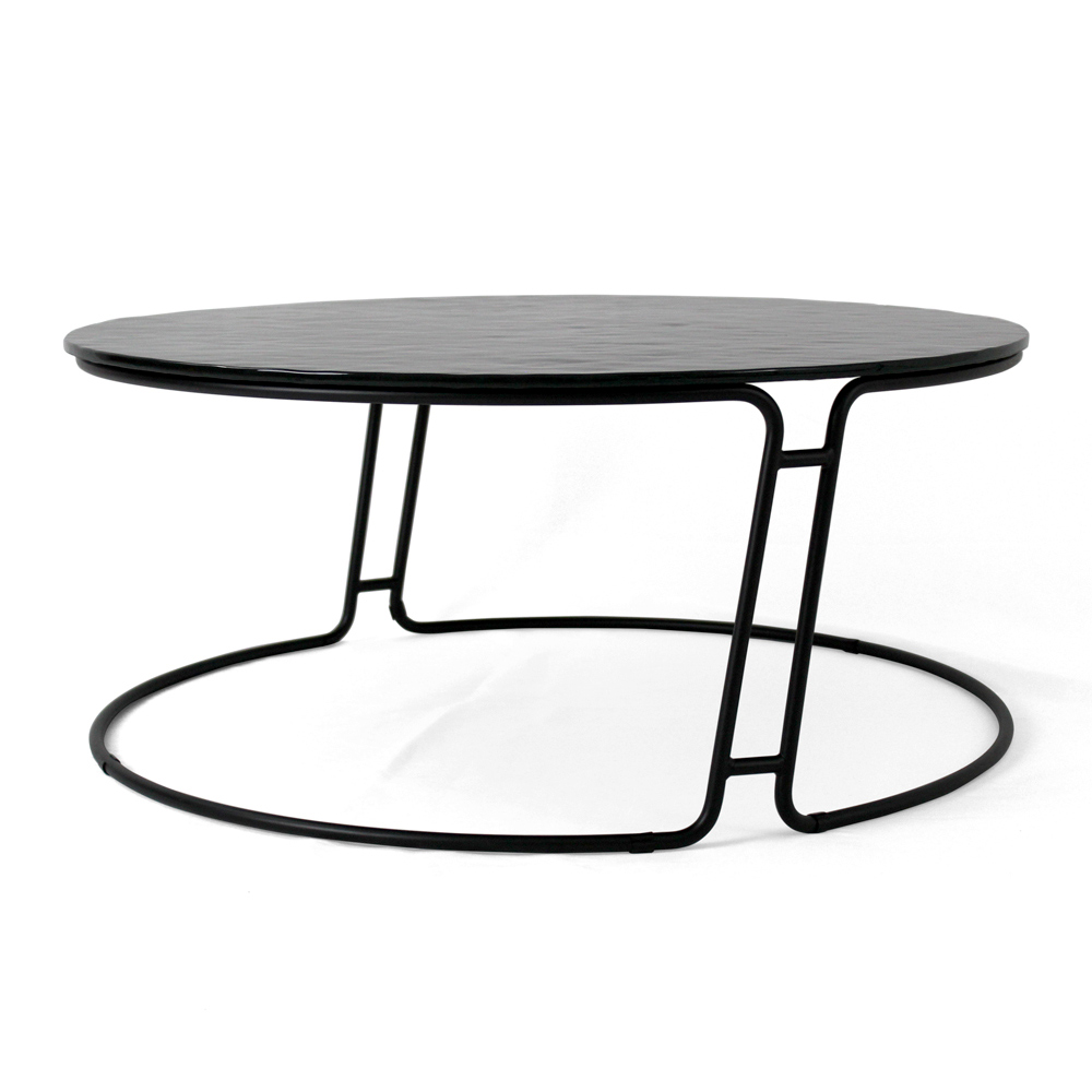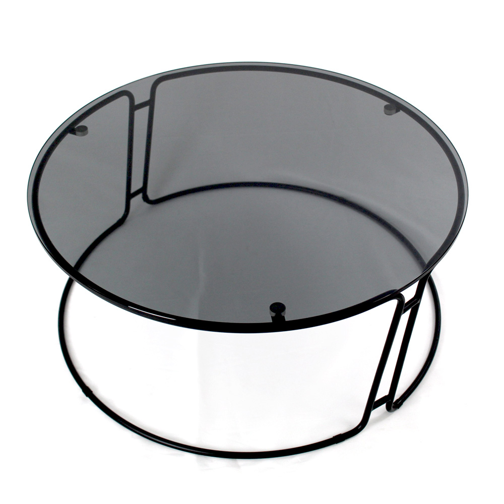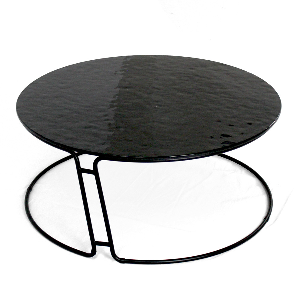 Tavolinë e rrumbullakët me bazë çeliku të lyer dhe majë xhami.