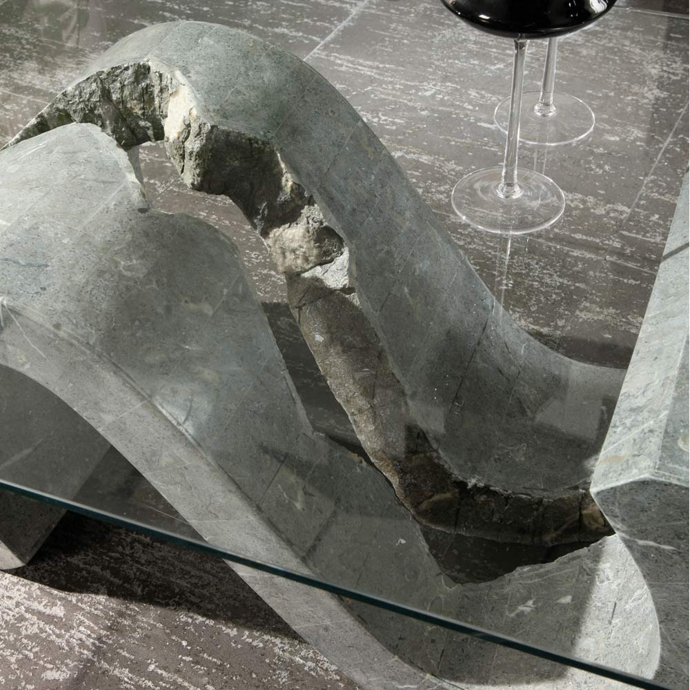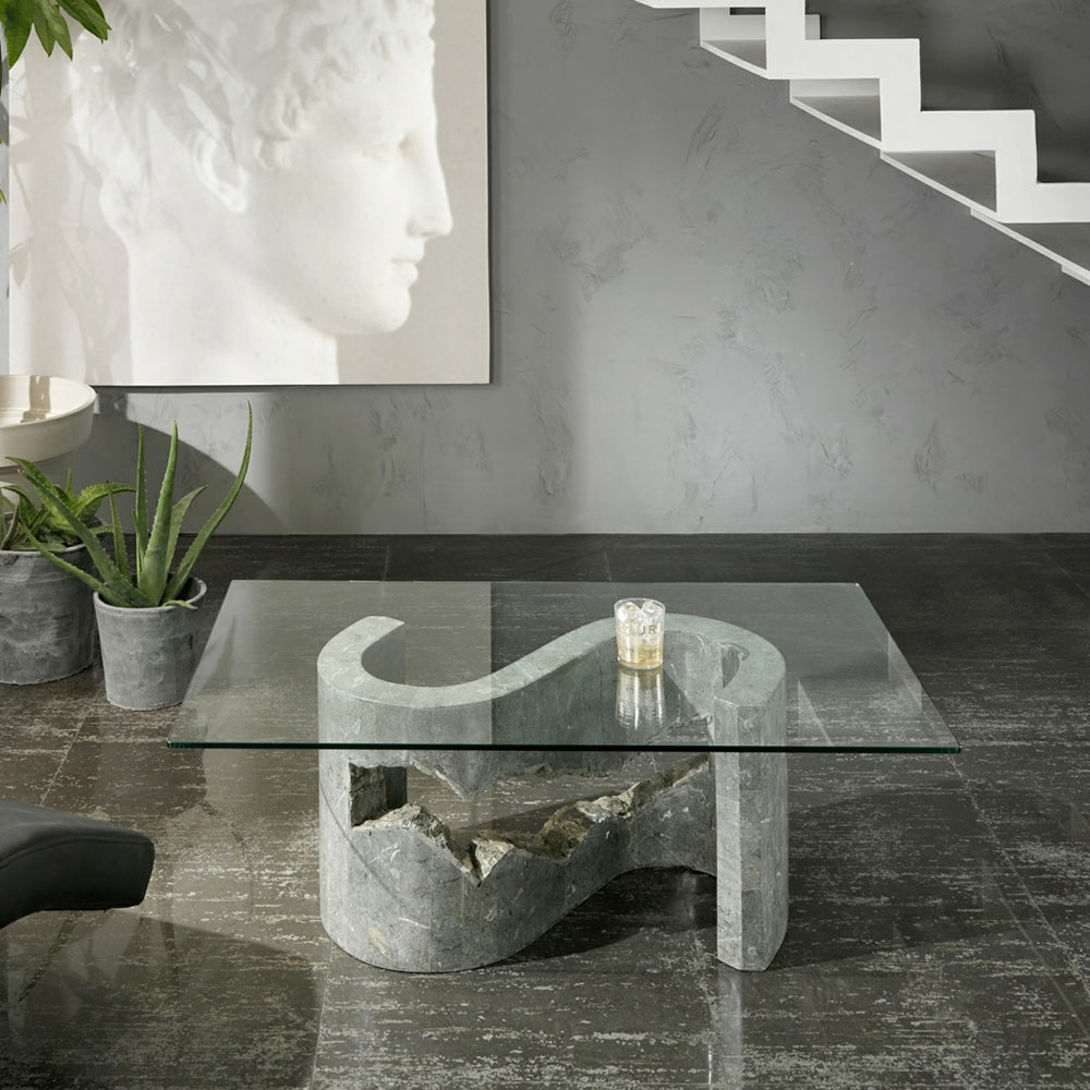Tavolina e kafesë është e pajisur me një majë xhami të lëmuar 10 mm dhe një bazë prej guri fosile gri, e cila paraqet një dizajn origjinal dhe elegant.