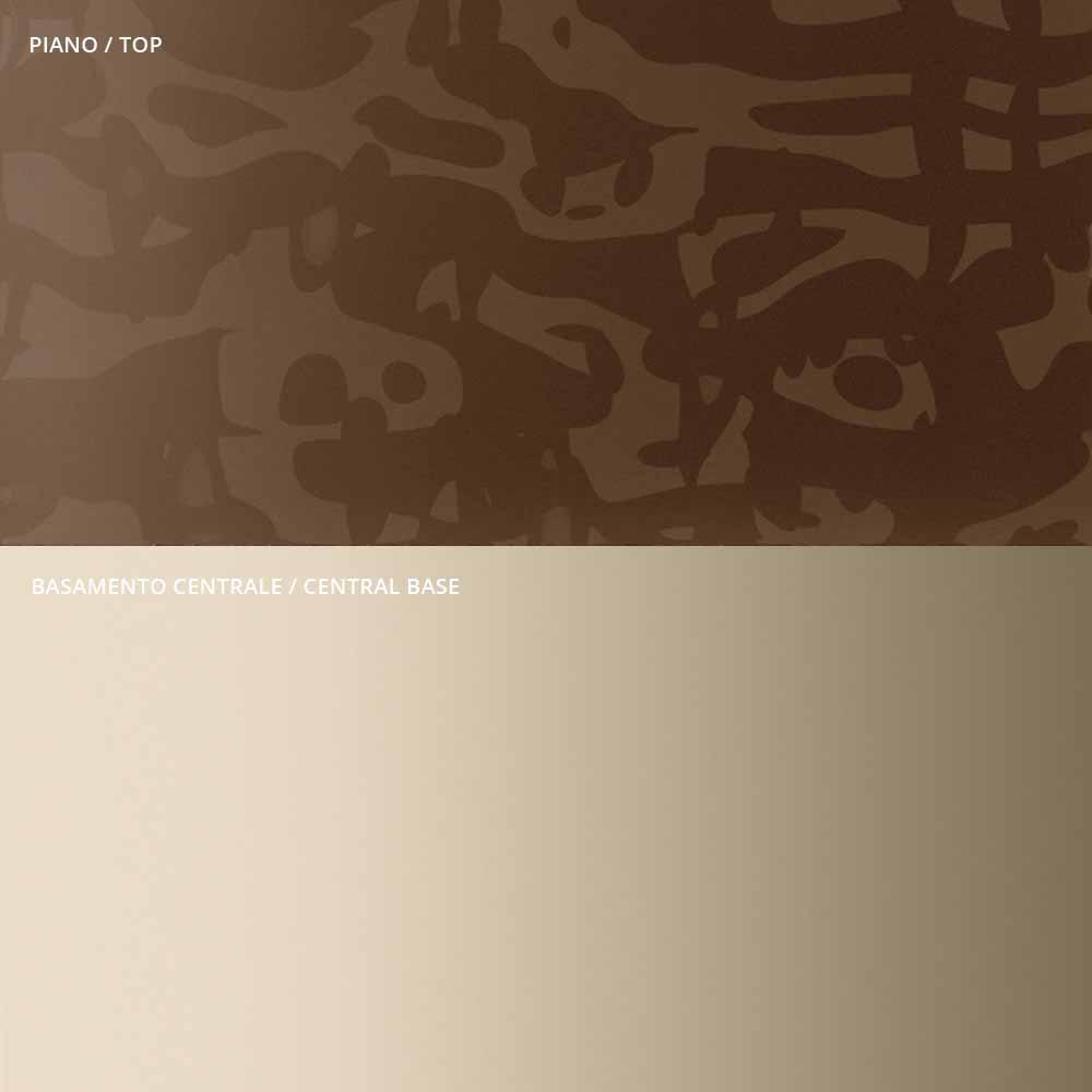 Tavolinë kafeje e bërë ose me një majë xhami të shkrirë dhe një bazë metalike me një profil të formësuar ose me një majë metalike me një profil në formë dhe një bazë xhami të shkrirë Prodhuar në Itali. Kërcelli qendror është gjithmonë në metal me një përfundim metalik shampanjë.