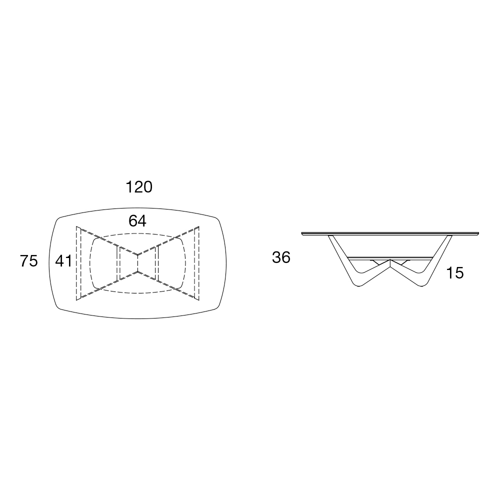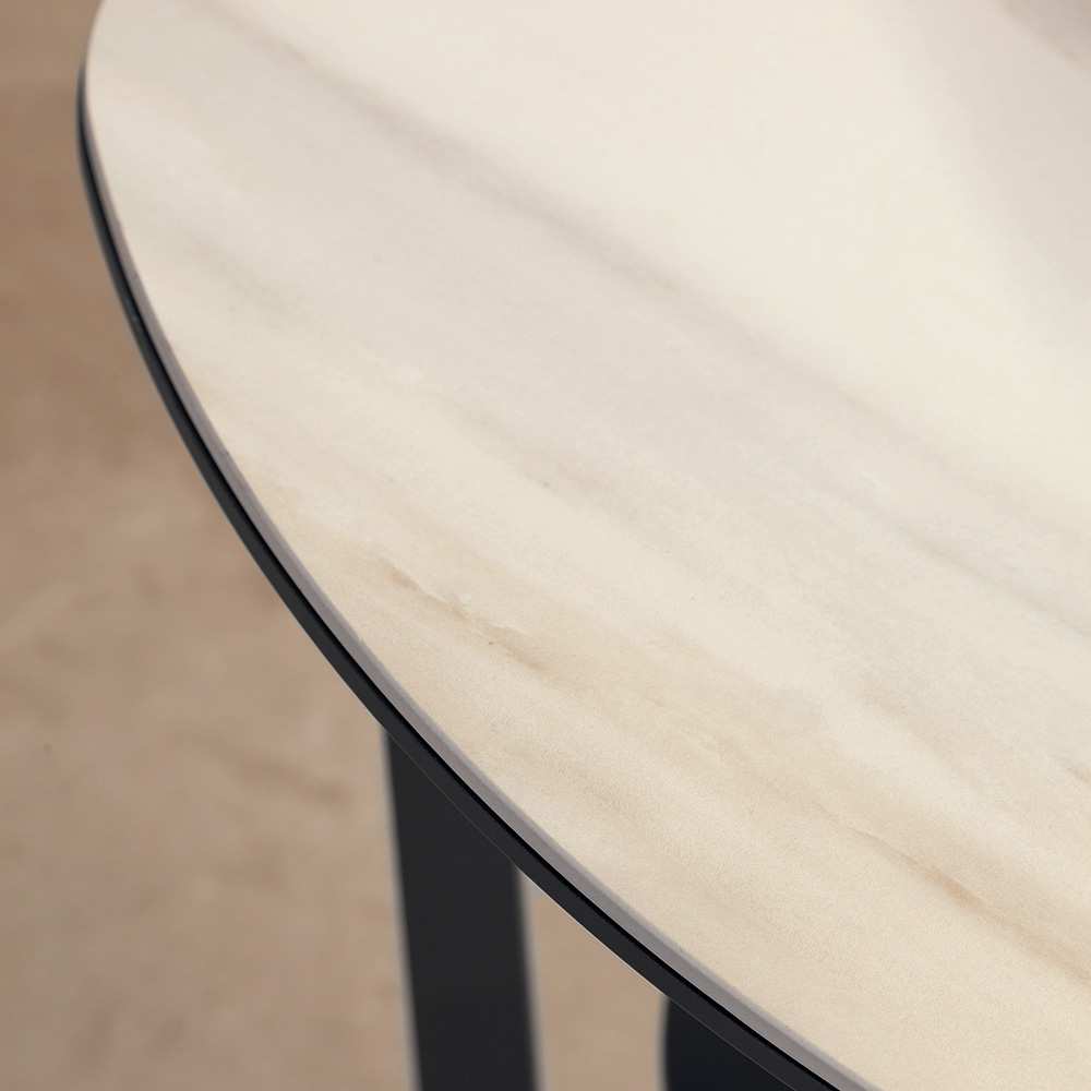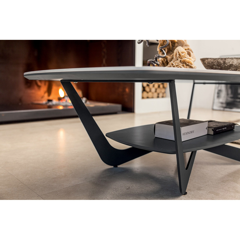 Kjo tavolinë kafejepërmban një bazë metalike të veshur me pluhur të stampuar me grafit dhe një majë qeramike me shkëlqim në panel. Karakteristika e veçantë e komplementit jepet nga rafti i poshtëm në të njëjtën ngjyrë si struktura, për një dizajn praktik dhe funksional që kursen hapësirë në zonën e ndenjes.