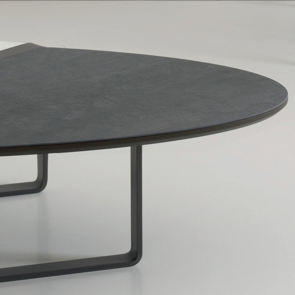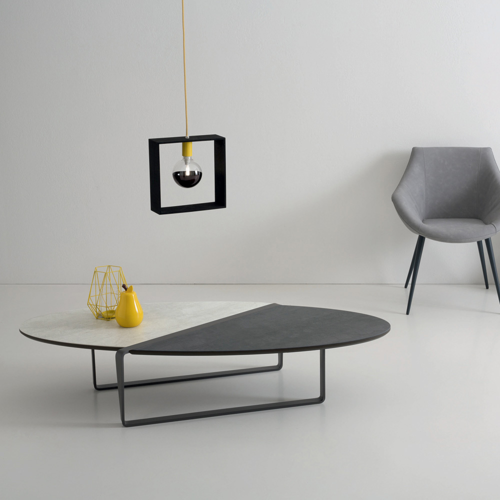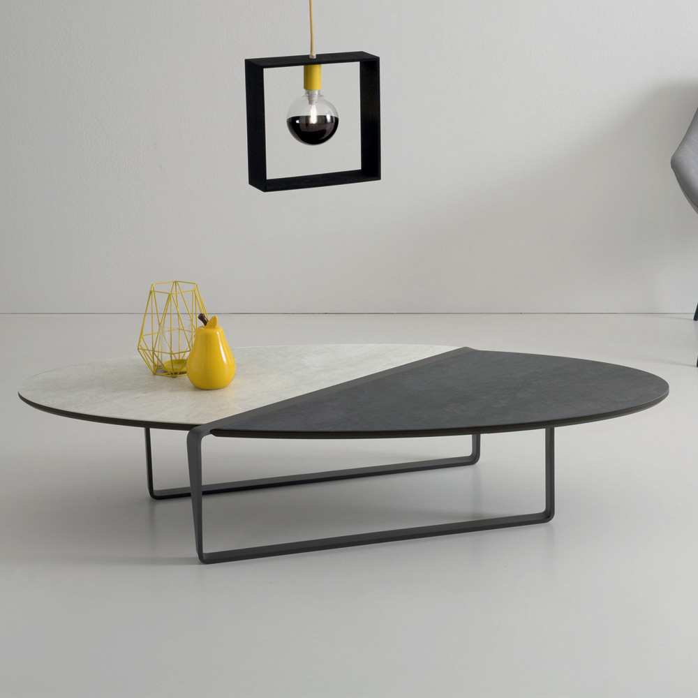 Tavolinë kafeje ovale me metal dhe majë qeramike dyngjyrëshe e prodhuar në Itali.