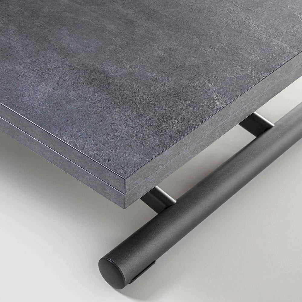 Tavolinë kafeje me pjesën e sipërme të melaminës dhe bazën metalike të përfunduar me antracit . Veçori e kësaj tryeze unike dhe inovative të kafesë është struktura e saj e cila lejon që ajo të shndërrohet shpejt dhe lehtë në një tryezë praktike ngrënieje. Kjo karakteristikë maksimizon funksionalitetin e saj , duke lejuar kështu marrjen e dy artikujve në një dhe në të njëjtën kohë duke optimizuar hapësirat falë madhësisë së vogël të tryezës sapo të mbyllet. Në këtë mënyrë është e mundur të merrni një sipërfaqe mbështetëse shumëfunksionale, ideale si për dreka dhe darka me miqtë ashtu edhe për pije, revista, libra e kështu me radhë brenda dhomës tuaj të ndenjes. Dizajni i tij përshkruhet nga veçori tërafinuara dhe minimale, të afta për të furnizuar mjediset e shtëpisë tuaj me elegancë dhe praktike , duke tërhequr të gjithë vëmendjen tek vetja.