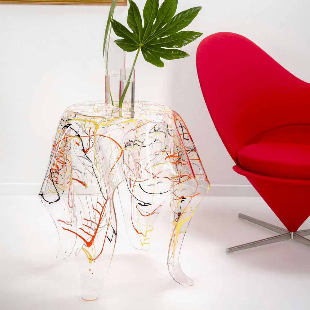 Tavolinë kafeje shumëngjyrësh Plexiglass e bërë në Itali, Otto Tabela e pikturuar Otto është një pjesë unike, një vepër e artit modern. Një fletë polimer 100% e pastër në pleksiglas të pastër PMMA me spërkatje bojë, të shtypur me dorë në temperatura të larta, për të krijuar një tabelë unike dhe të papërsëritshme.