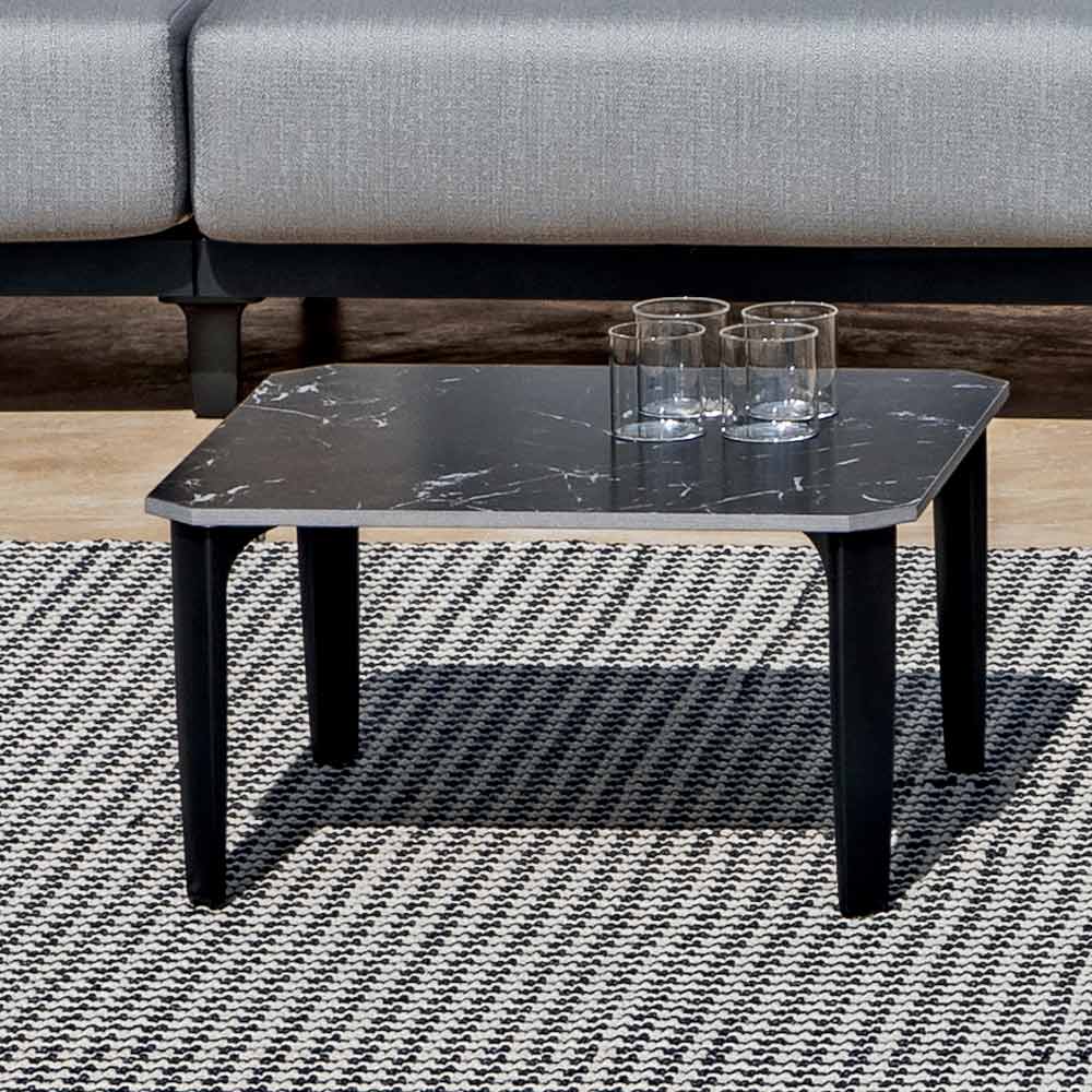 Tavolinë e ulët kafeje në natyrë e bërë prej alumini dhe maja katrore në prodhim gresi prej porcelani, artikull me cilësi të lartë i prodhuar në Itali.