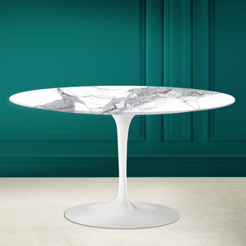 Tavolinë kafeje me majë ovale në statuar qeramike shumë të lartë, efekt mermeri statuario mat dhe bazë alumini e lëmuar tërësisht e prodhuar në Itali . Ky element ka dy karakteristika unike: qeramika shumë e gjatë statuja dhe forma ovale. Qeramika ka një grafikë shumë të hollë dhe komplekse që arrin t'i japë një atmosferë të ngrohtë dhe mikpritëse çdo ambienti jetese pa harruar cilësinë dhe rezistencën e materialit. Forma e veçantë ovale përdoret gjithnjë e më shumë për të arreduar dhomat me një ide origjinale falë linjës dhe prakticitetit dhe funksionalitetit të saj.
