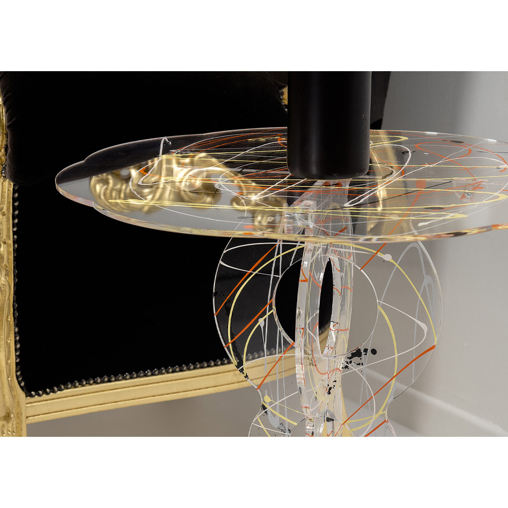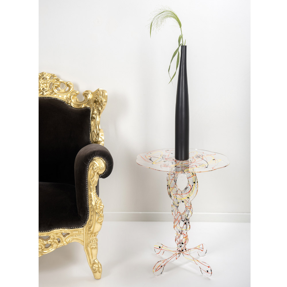 Kjo tavolinë kafeje ka një dizajn të rrumbullakët të bërë tërësisht nga kristal akrilik 100% PMMA nga polimer i virgjër me një bazë transparente të prerë me lazer me dekorime të frymëzuara nga maure dhe një majë me bojë që spërkatet me dorë në homazh të Jackson Pollock për një prekje origjinaliteti.