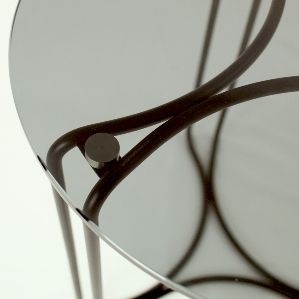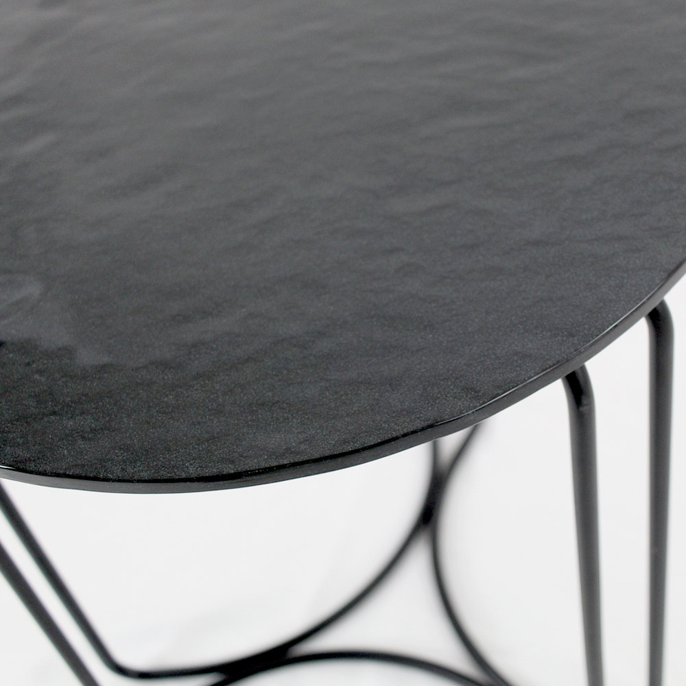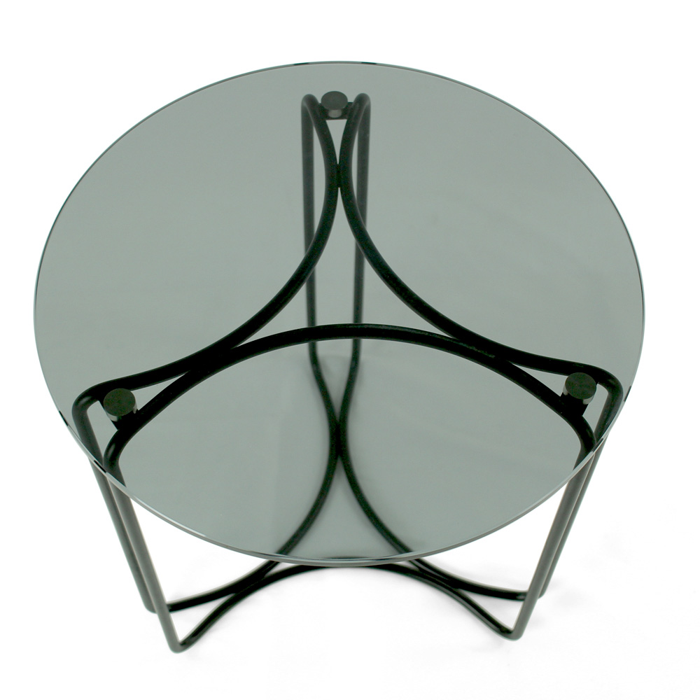 Tavolinë e rrumbullakët me bazë çeliku të lyer dhe majë xhami.