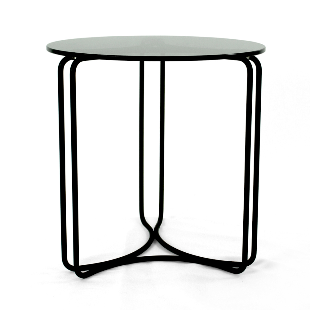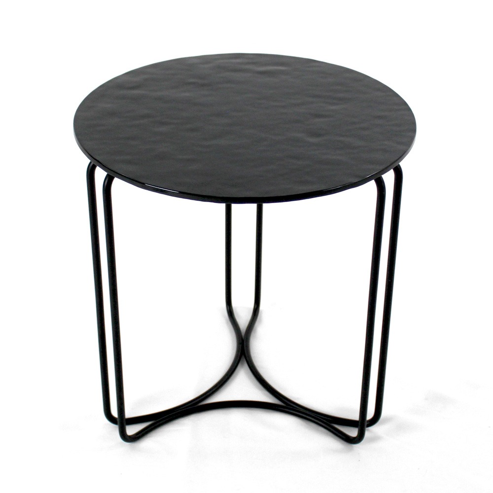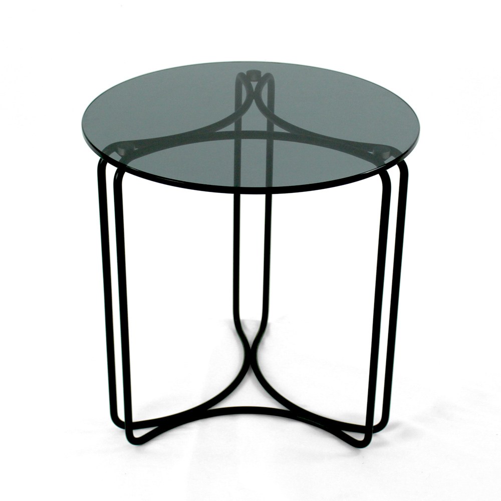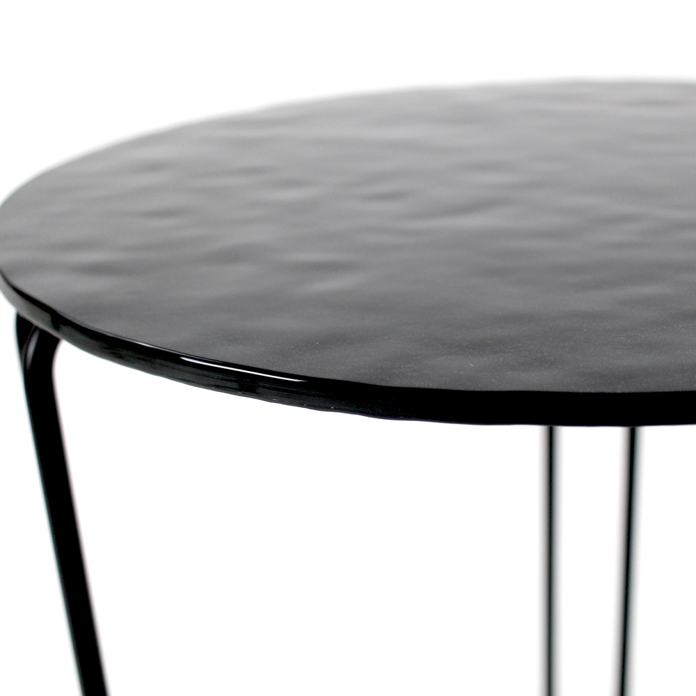 Tavolinë e rrumbullakët me bazë çeliku të lyer dhe majë xhami.