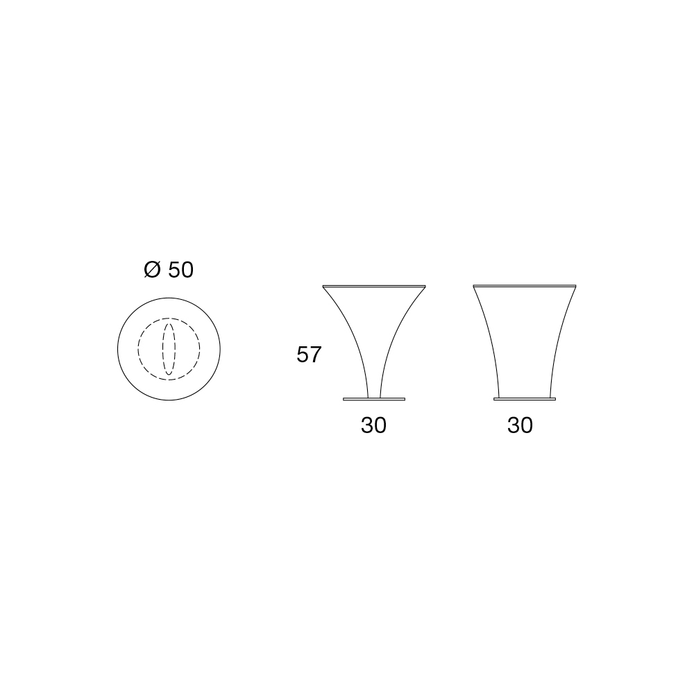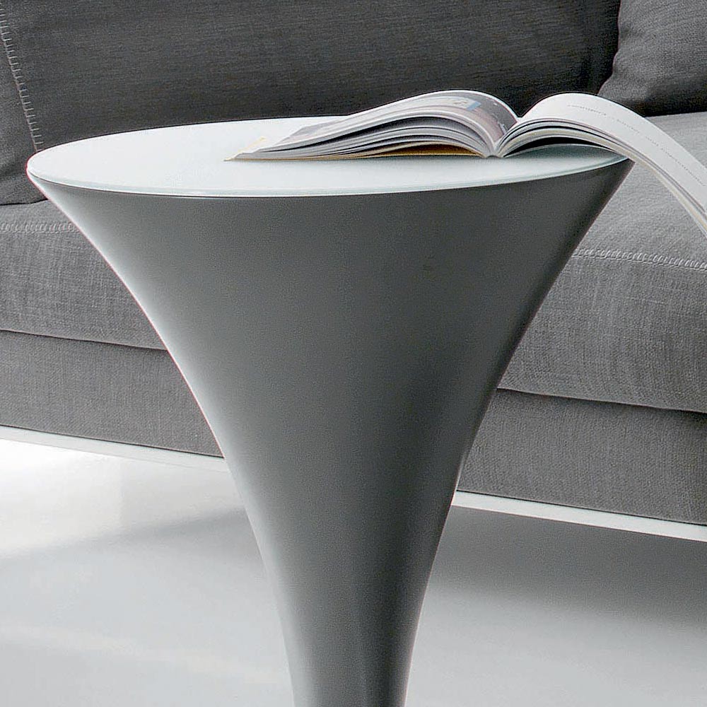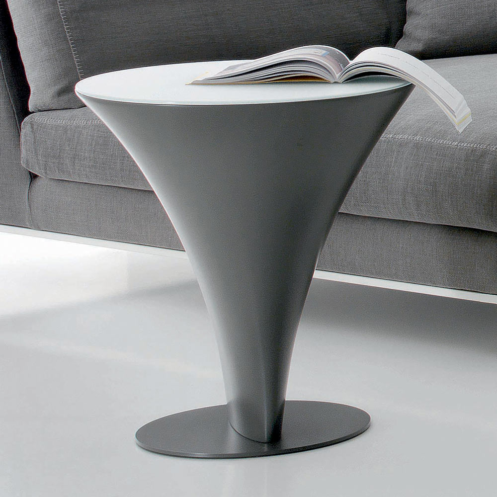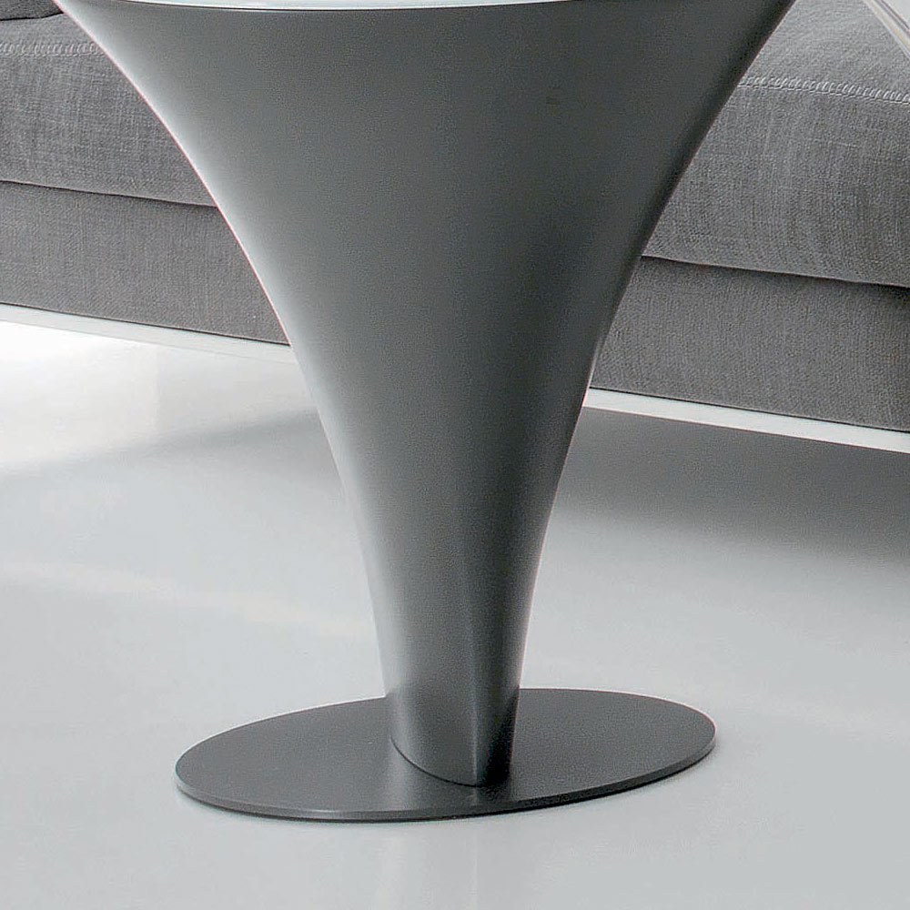 Kjo tavolinë kafeje e rrumbullakët ka një strukturë në poliuretani dhe bazë metalike të lyer me xham të ngrirë. Karakteristika e veçantë e komplementit jepet nga baza e fortë që ngushtohet në tokë duke u ankoruar në një çakëll që i jep atij stabilitet, duke i dhënë një formë origjinale varke që përmirësohet nga shkëlqimi i majës së xhamit.