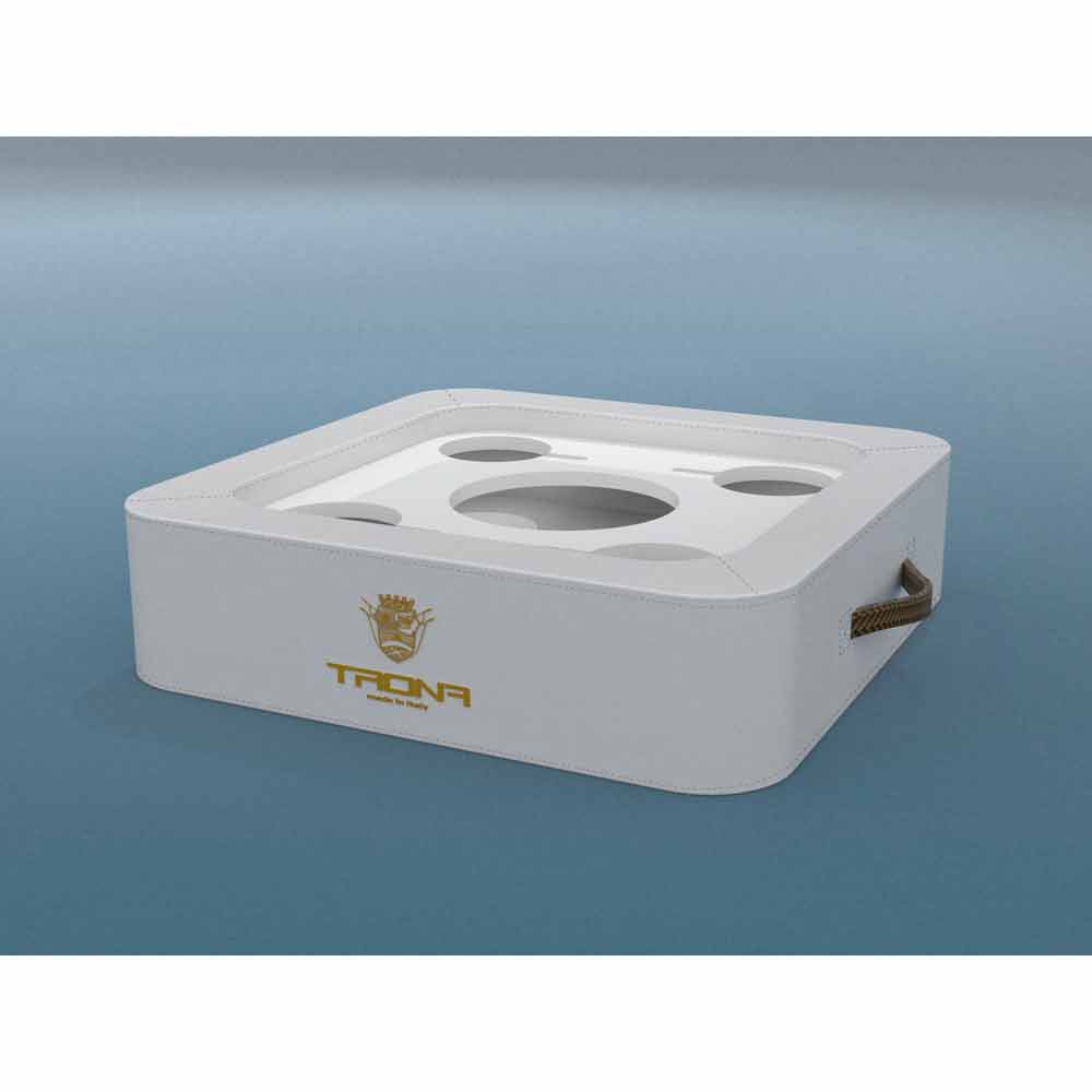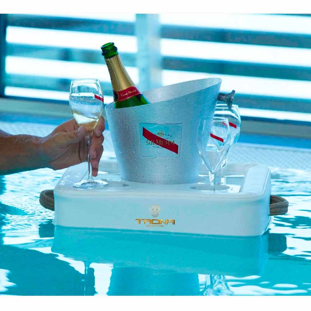 Falë pllakës speciale të pleksiglasit me vrima, Trona mbështet shishen, kovën e akullit dhe gotat në siguri të plotë, pa rrezikun e përmbysjes. Trona ka një ndarje qendrore që përdoret si mbajtëse kosi / shishe akulli dhe 4 vrima për të mbajtur gota me gotë ose koktej.