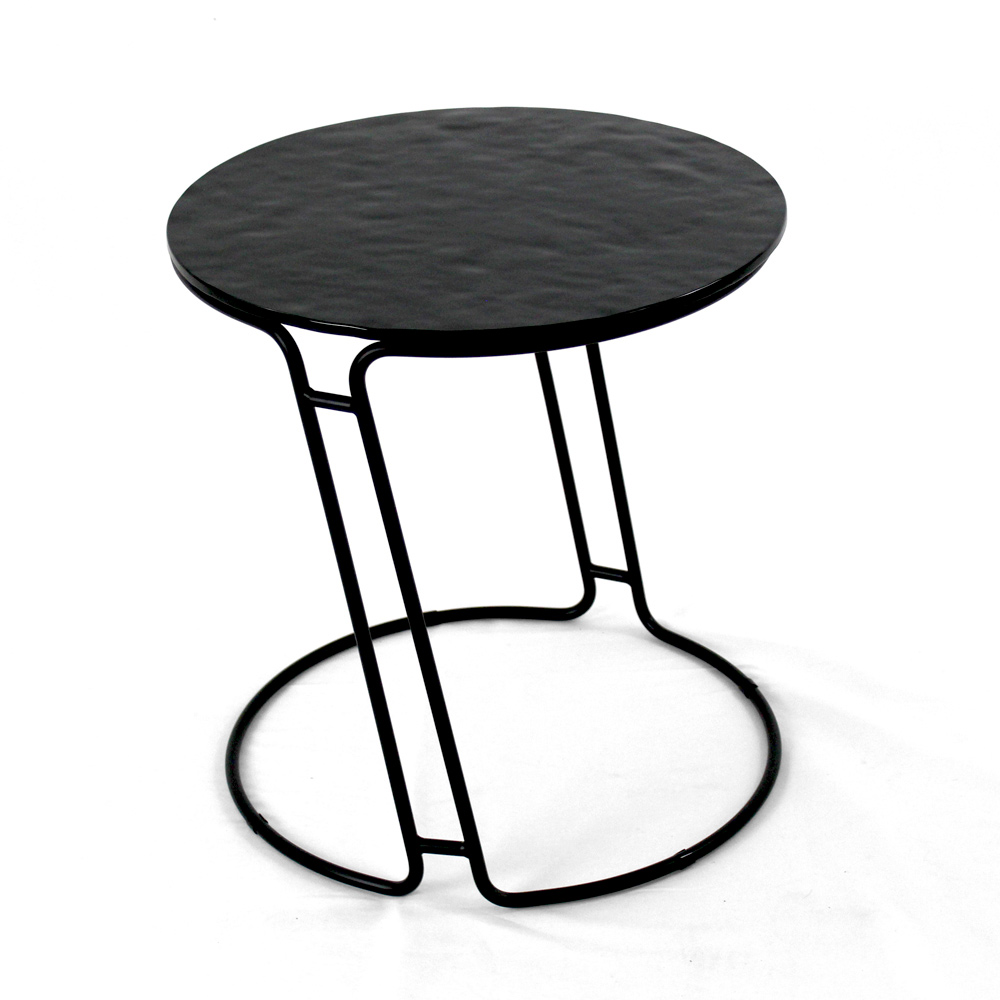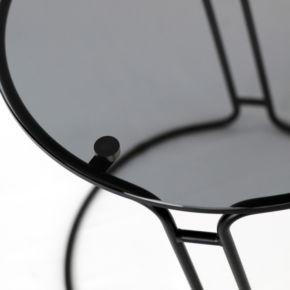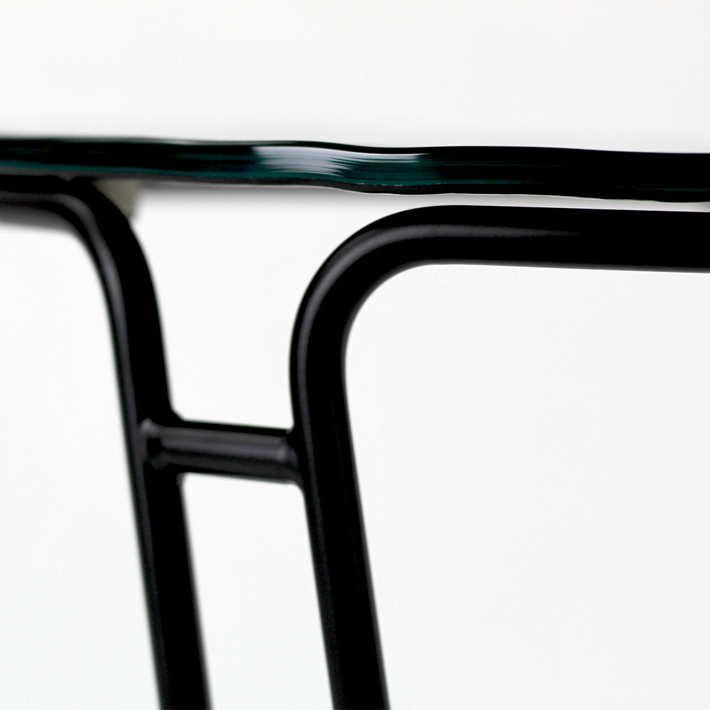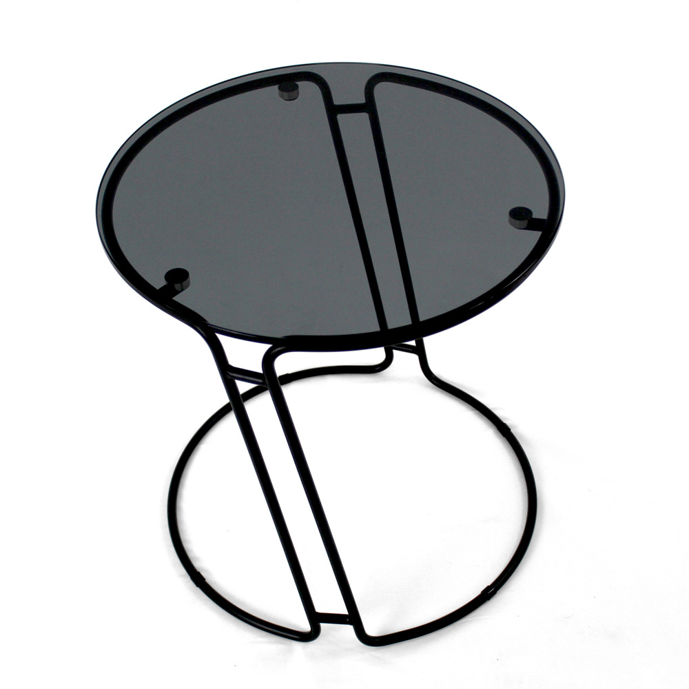 Tavolinë e rrumbullakët me bazë çeliku të lyer dhe majë xhami.