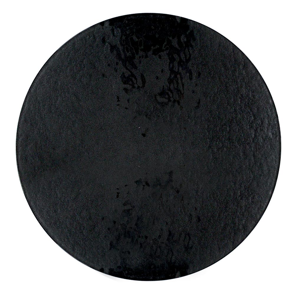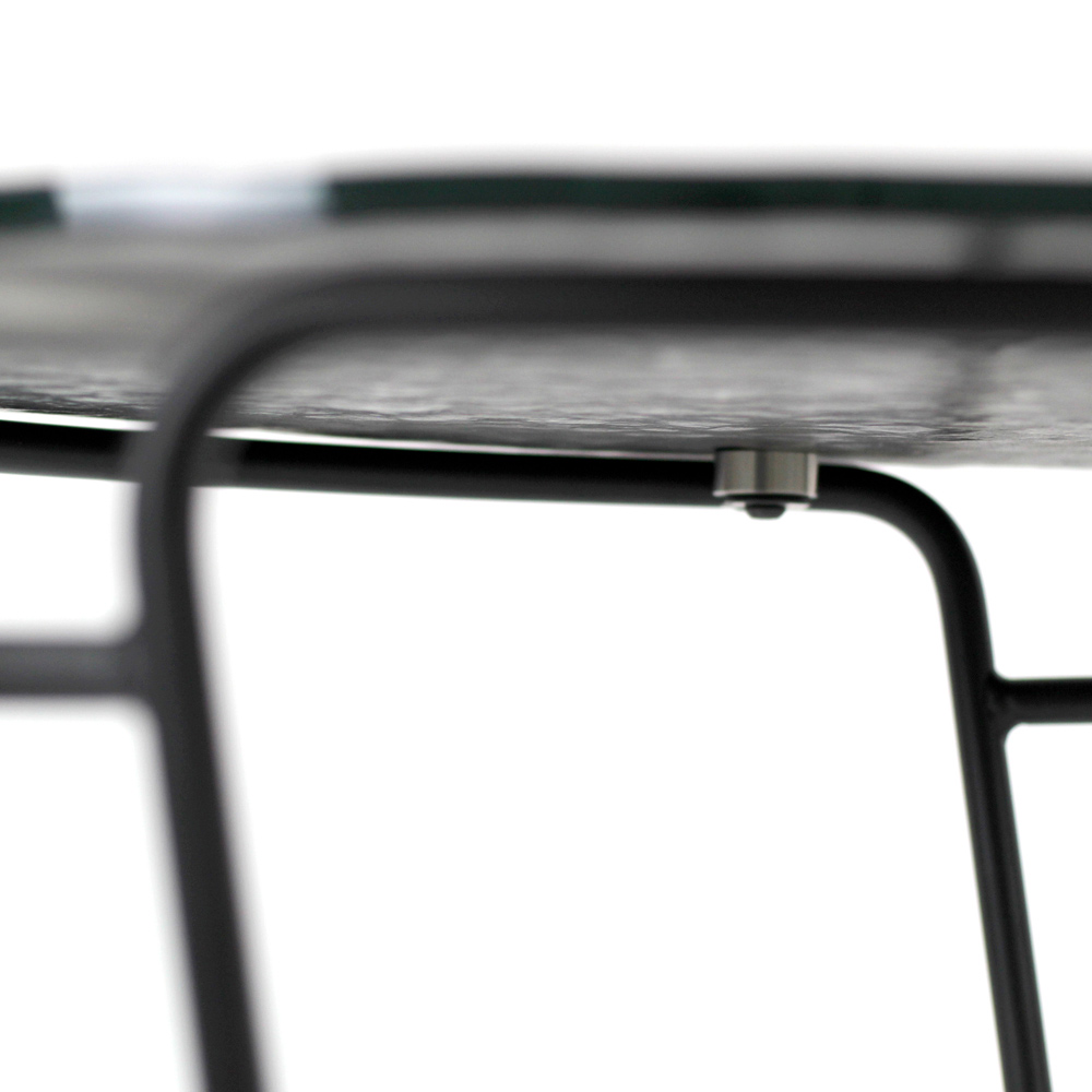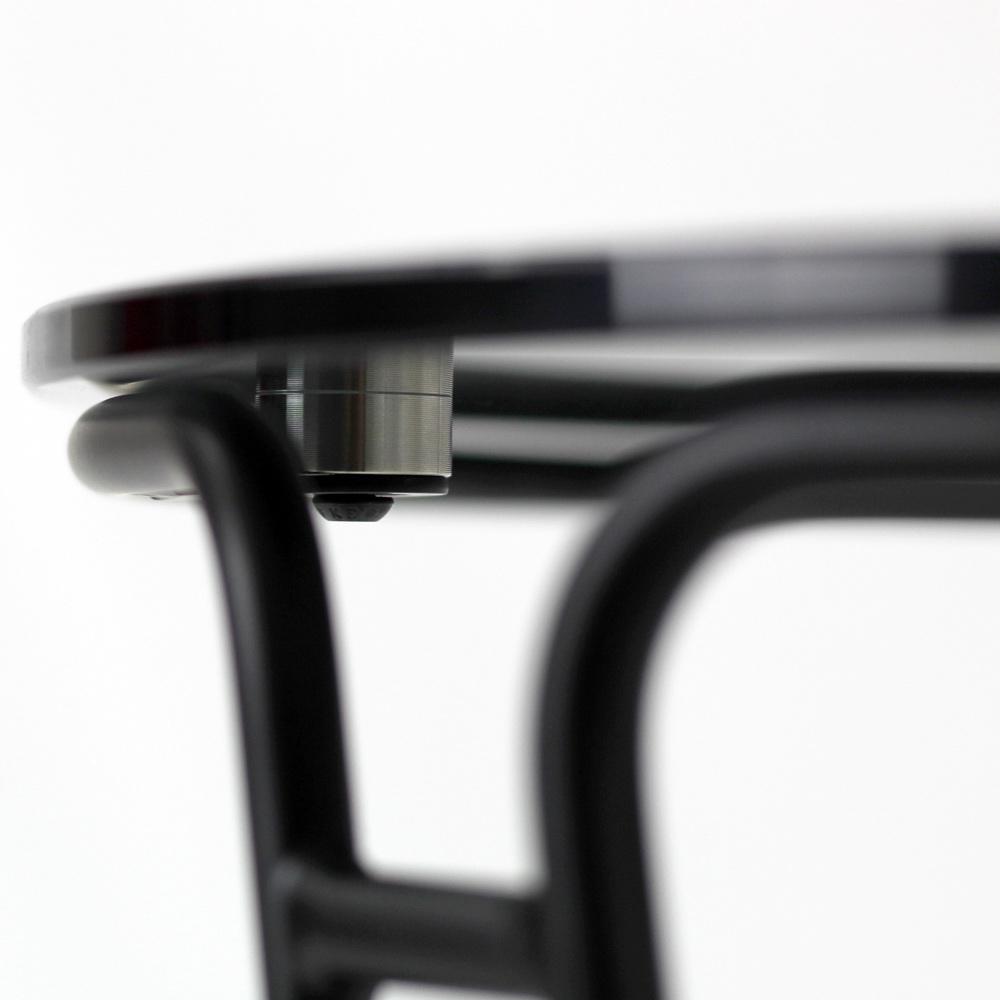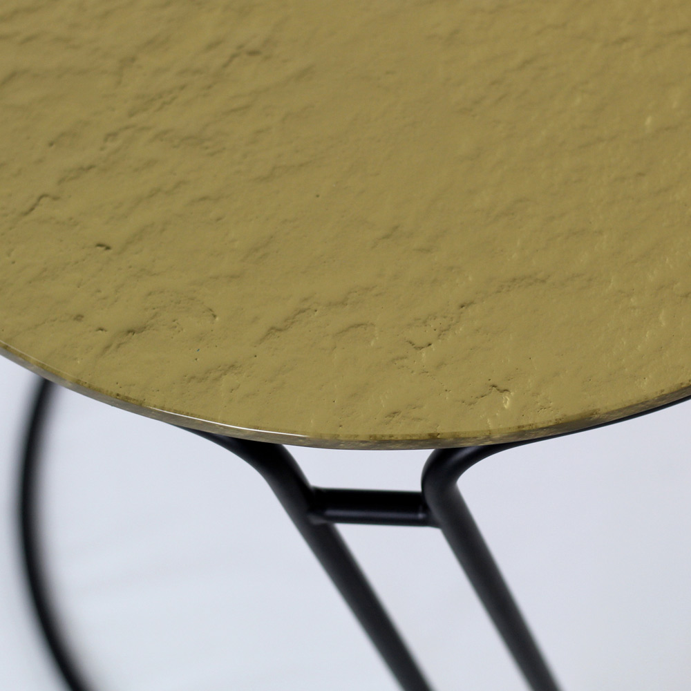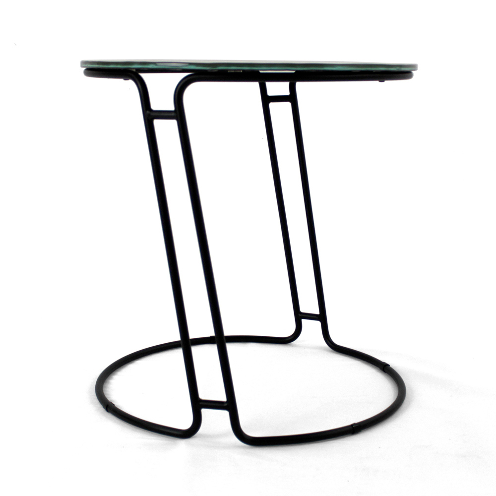 Tavolinë e rrumbullakët me bazë çeliku të lyer dhe majë xhami.