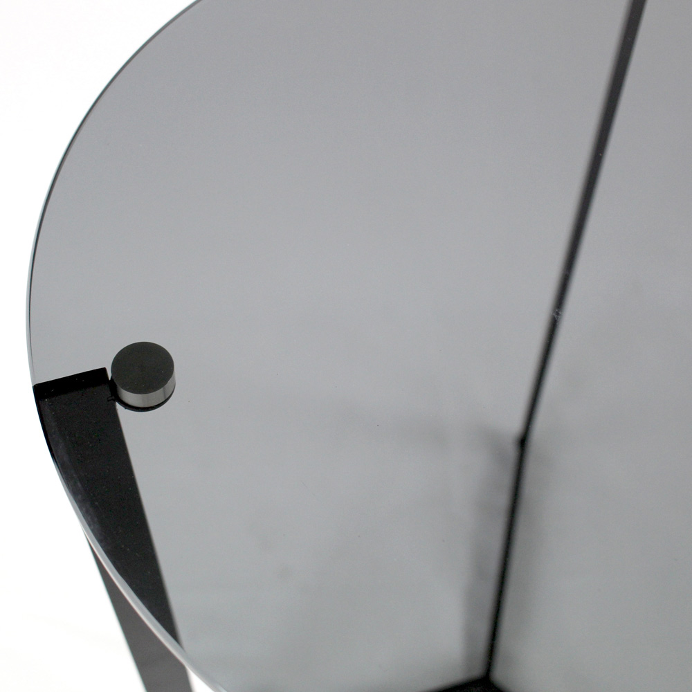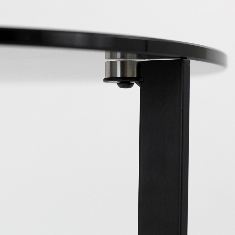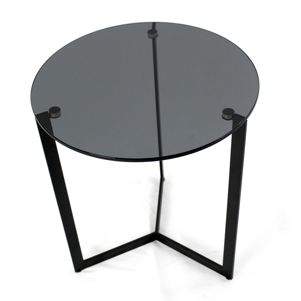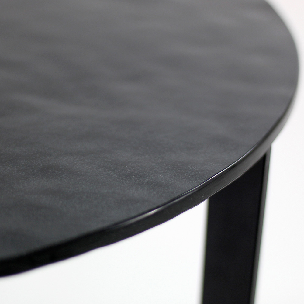 Tavolinë e rrumbullakët me bazë çeliku të lyer dhe majë xhami.