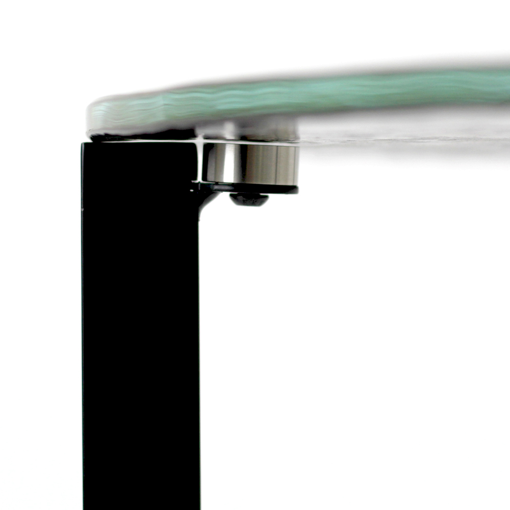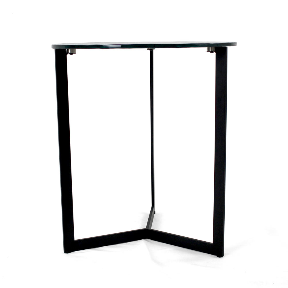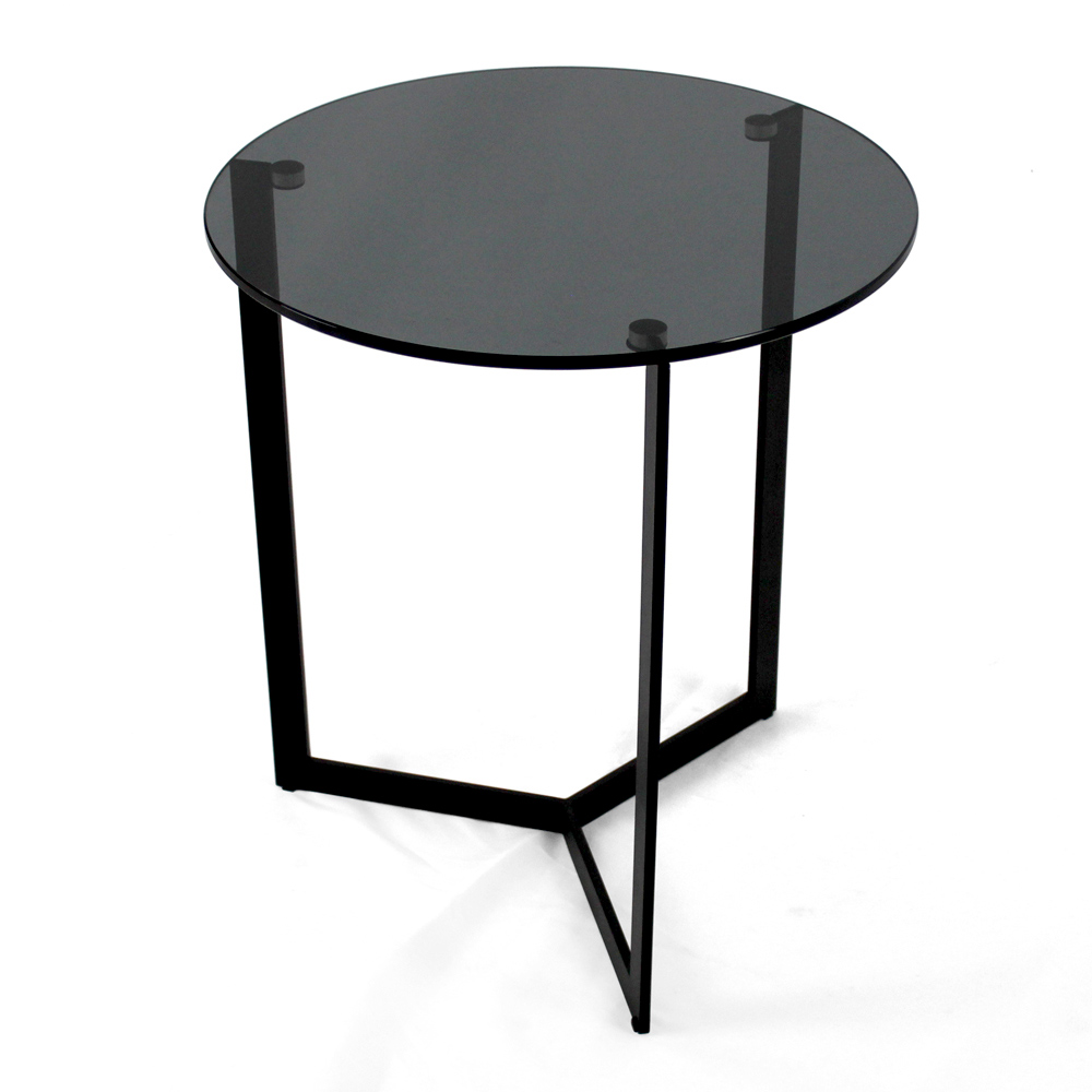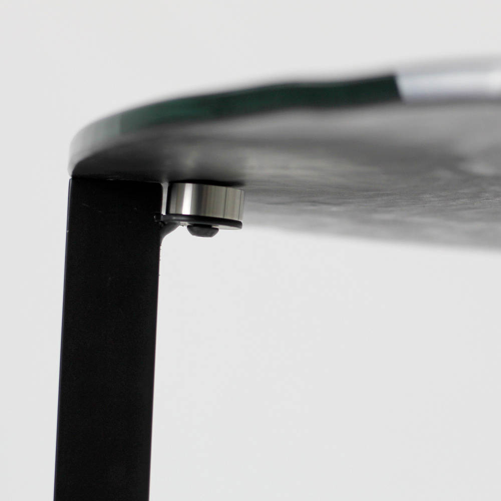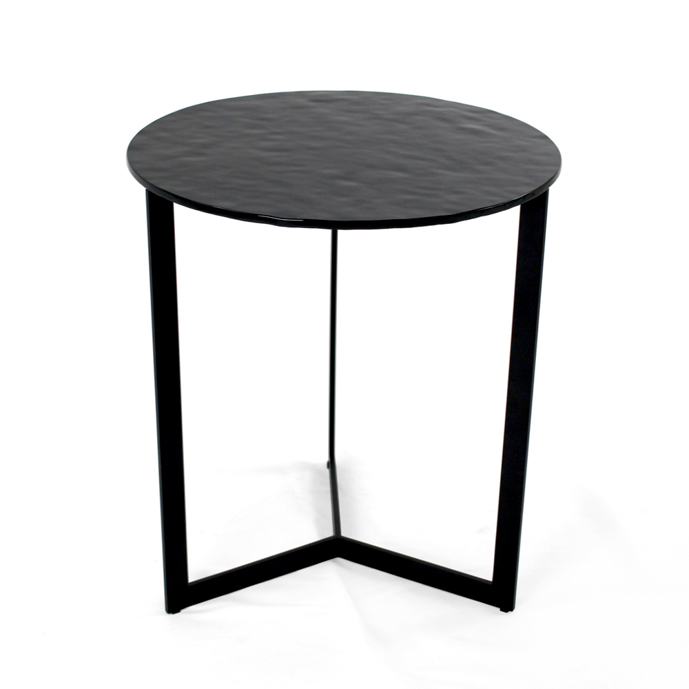 Tavolinë e rrumbullakët me bazë çeliku të lyer dhe majë xhami.