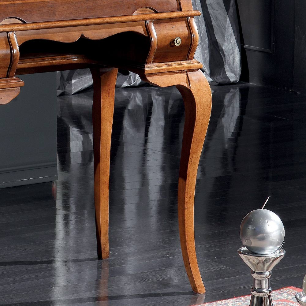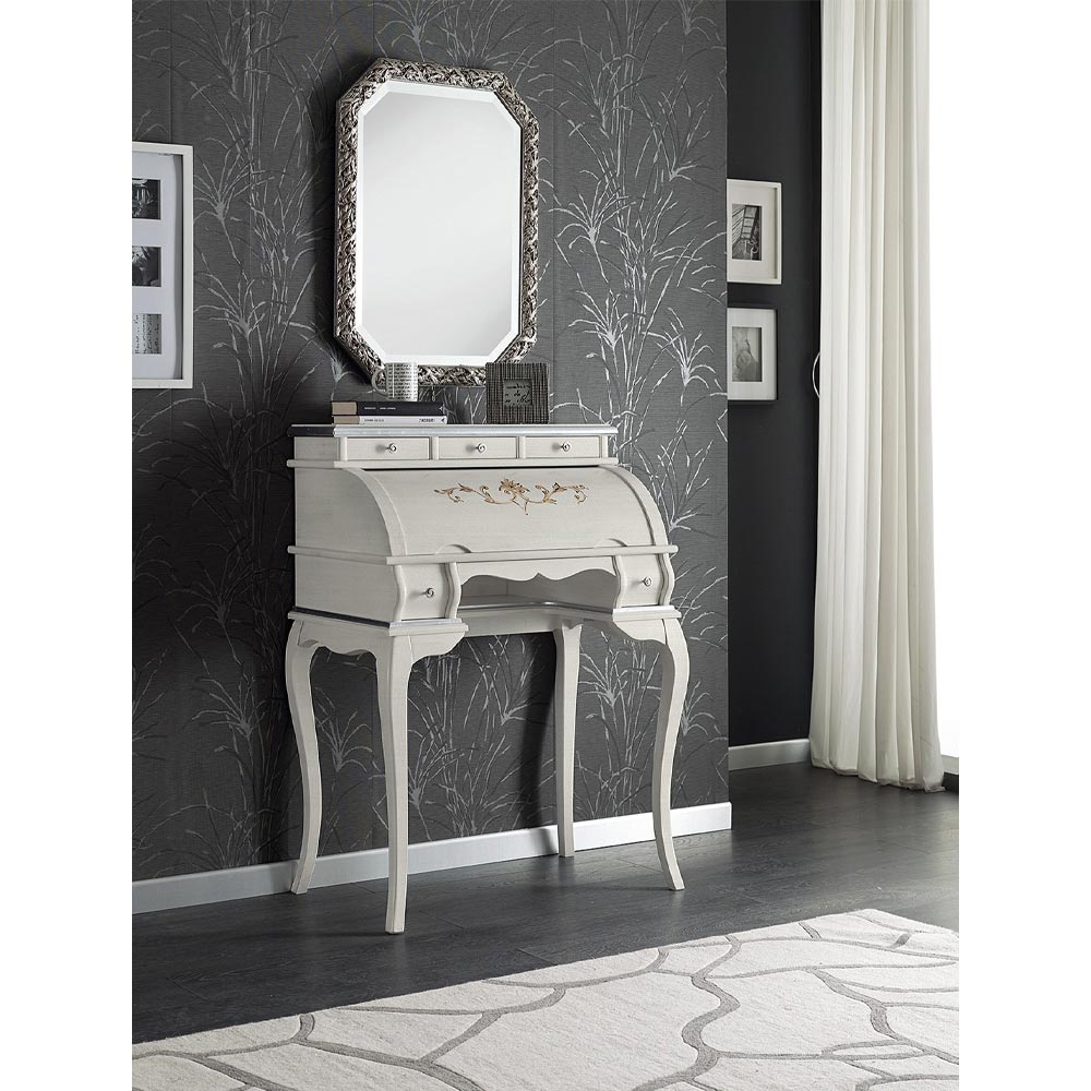 Tavolinë e stilit klasik prej druri të imët , e disponueshme në ngjyrë arre ose të bardhë. Kjo mobilje praktike dhe e rafinuar ka 5 sirtarë, një grilë të zbukuruar dhe raft të tërhequr dhe është ideale për t'u përdorur si një tavolinë ose njësi praktike ruajtjeje. Unik dhe i rafinuar, është bërë tërësisht në Itali nga mjeshtra të aftë , i përfunduar me mençuri dhe shije për elegancë. Prodhimi kryhet duke përdorur materiale të shkëlqyera , dhe duke kryer punënmedorë me kujdesin dhe profesionalizmin maksimal që i dallon produktet Made in Italy .
