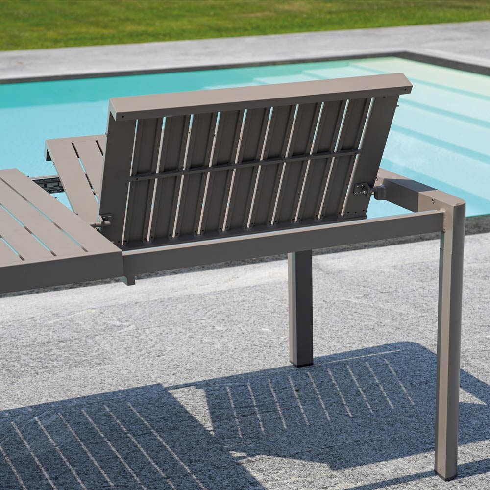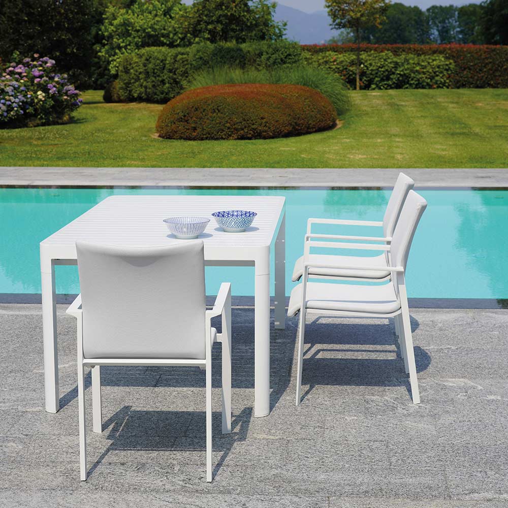 Tavolinë kopshti prej alumini me pjesën e sipërme me rrasa që zgjatet deri në 240 cm falë këmbëve funksionale rrëshqitëse . Një mobilje, estetika e së cilës karakterizohet nga vëllime të balancuara dhe forma të qarta që e lejojnë atë të arredojë çdo kontekst të jashtëm, si shtëpiak ashtu edhe kontraktor, me elegancë moderne . Tavolina karakterizohet nga një qëndrueshmëri dhe qëndrueshmëri e shkëlqyer dhe në të njëjtën kohë një dizajn jashtëzakonisht i thjeshtë dhe i gjithanshëm i përsosur për të kënaqur çdo lloj nevoje.