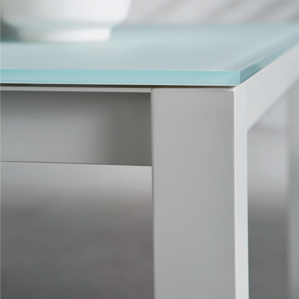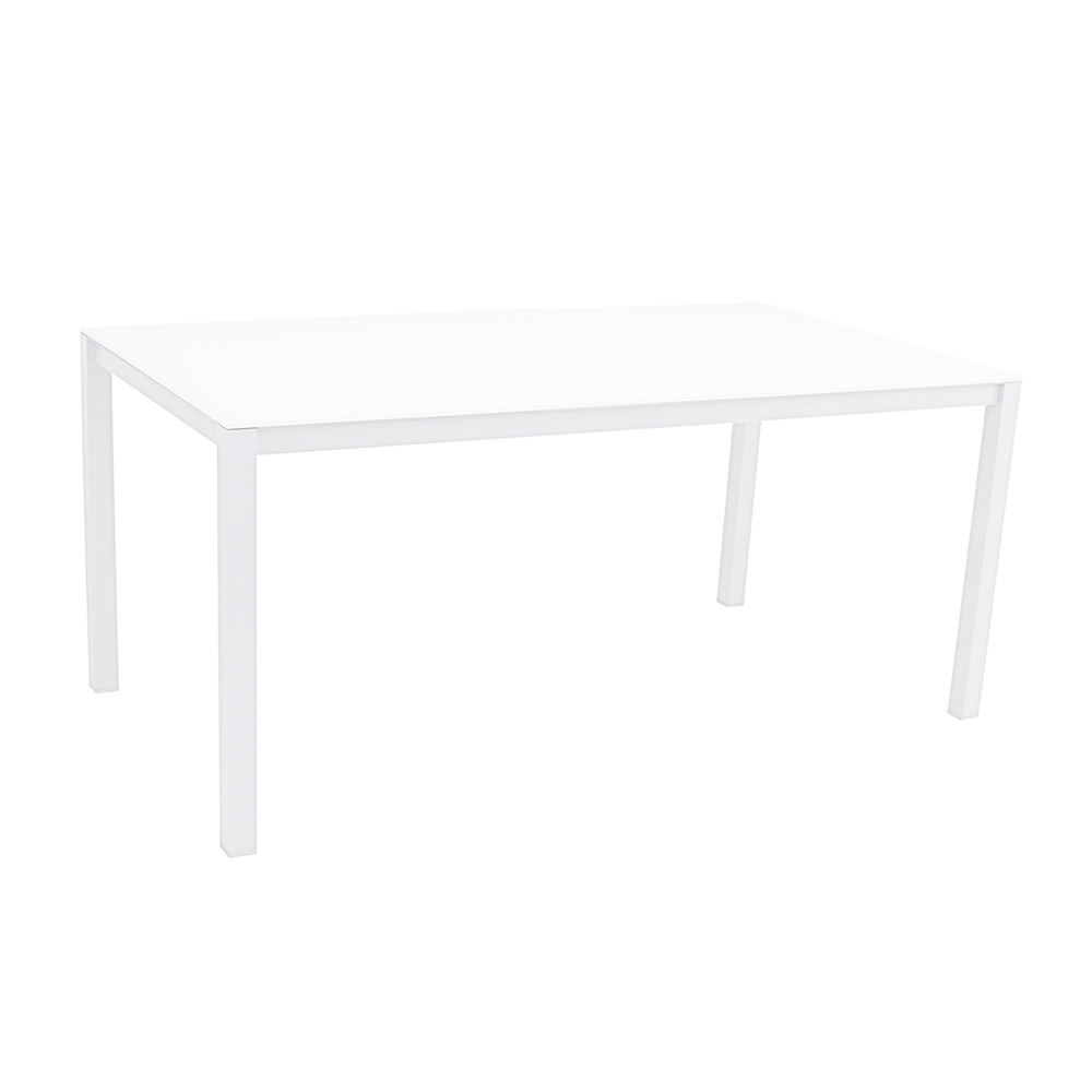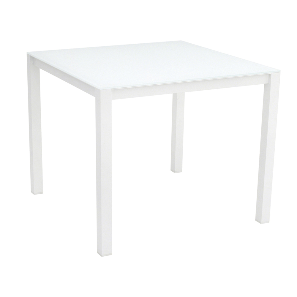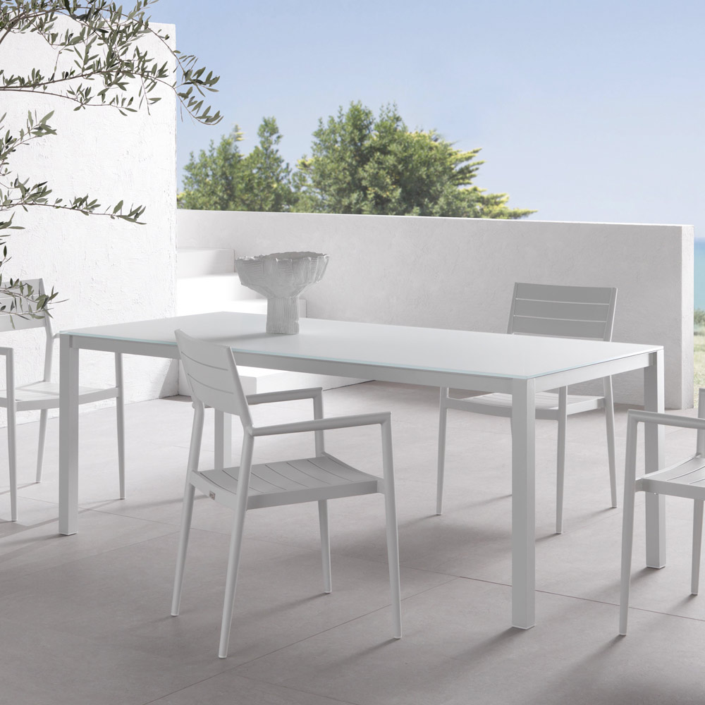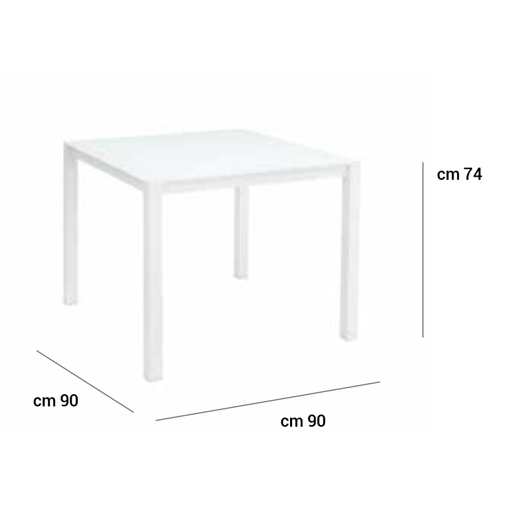 Tavolinë ngrënieje kopshti e bërë nga alumini i lyer me pluhur epoksid dhe pjesa e sipërme e xhamit të lyer me pjesën e pasme.Kjo tavolinë karakterizohet nga format e saj të forta katrore të cilat arrijnë të përshtaten me çdo lloj ambienti bashkëkohor të jashtëm, duke i dhënë asaj një karakter të fortë modern dhe personal . Materialet e tij cilësore janë bërë për të qenë rezistente dhe jetëgjatë.